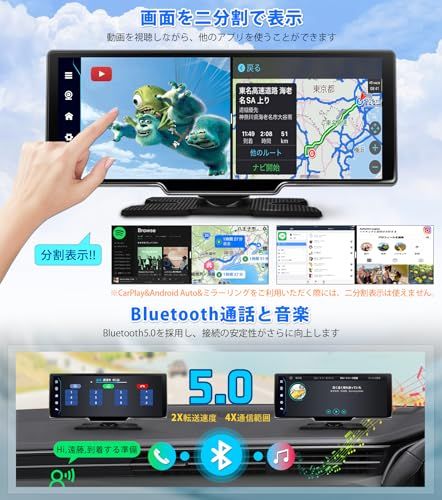 【2画面分割機能に対応 2倍の楽しさ】分割表示機能を使って、ナビと音楽/動画アプリを同時に楽しむことが可能です。走行中でも画面切り替え不要で、曲の変更がスムーズに行えます。
