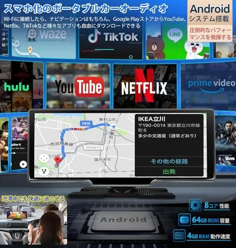 【KASUVAR 初のAndroid システム搭載のポータブルディスプレイオーディオ登場!】Wi-Fi/スマホのWi-Fiテザリングを接続すれば、いつも最新のオンライン地図を利用可能。YouTube、Netflix、Prime Videoなど、スマホでよく使っているエンタメアプリもGoogle Playストアから自由にインストールできます。仕事終わり、車に乗った瞬間から毎日のリラックスタイムが始まる。