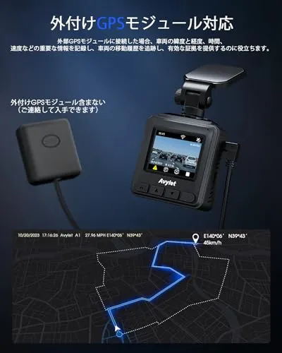 【Wi-Fi付き・スマホ連動・外付けGPSモジュール端子付き】このドラレコは、WiFi機能が搭載されるので、本体ボタンで操作することだけでなく、スマホの専用無料のアプリ「Avylet」をして、機能設定やリアルタイム映像確認やアプリアルバムへの映像のダウンロード(データ通信量不要)などの操作をスマホから簡単に行えます。人気のあるソーシャルメディアプラットフォームやメッセージングアプリを介して、ダウンロードされたファイルも友人や家族と共有(データ通信量必要)できます。直感的なアプリで、ストレスなくドライブレコーダーを利用できます。(iPhoneもAndroidも対応)それから、外付けGPSモジュール端子付き、GPSモジュール(別売り)を接続している場合、位置情報を正確に記録して、車の走行ルートや速度、時間を把握できます。事故やあおり運転などの交通トラブルが発生した際には証拠として大いに役立つでしょう。(GPSデータのある動画を再生するには、専門なプレーヤーをダウンロードする必要)(外付けGPSモジュールと再生プレーヤーの入手は、説明書に記ている公式メールアドレスにご連絡ください。)