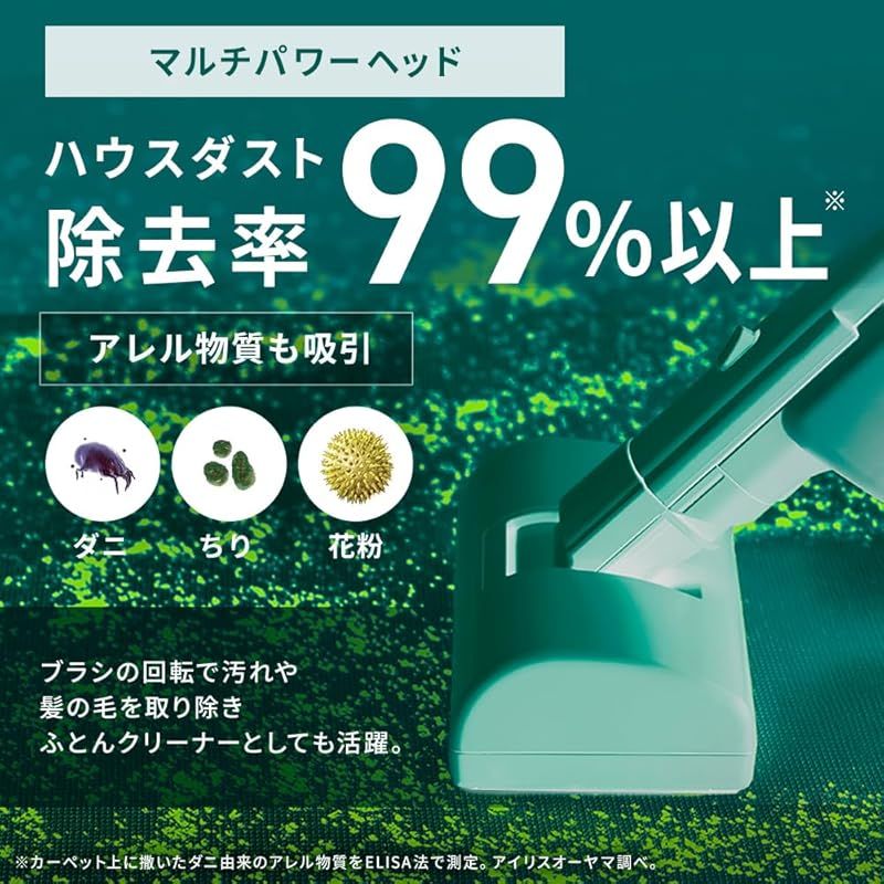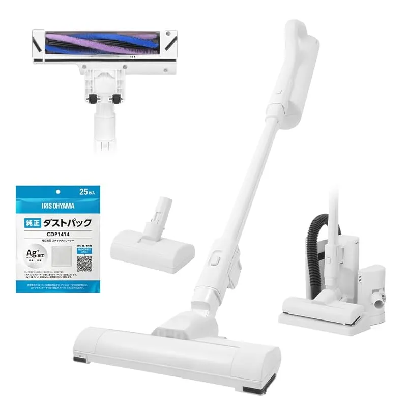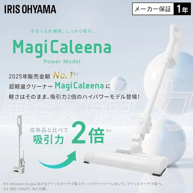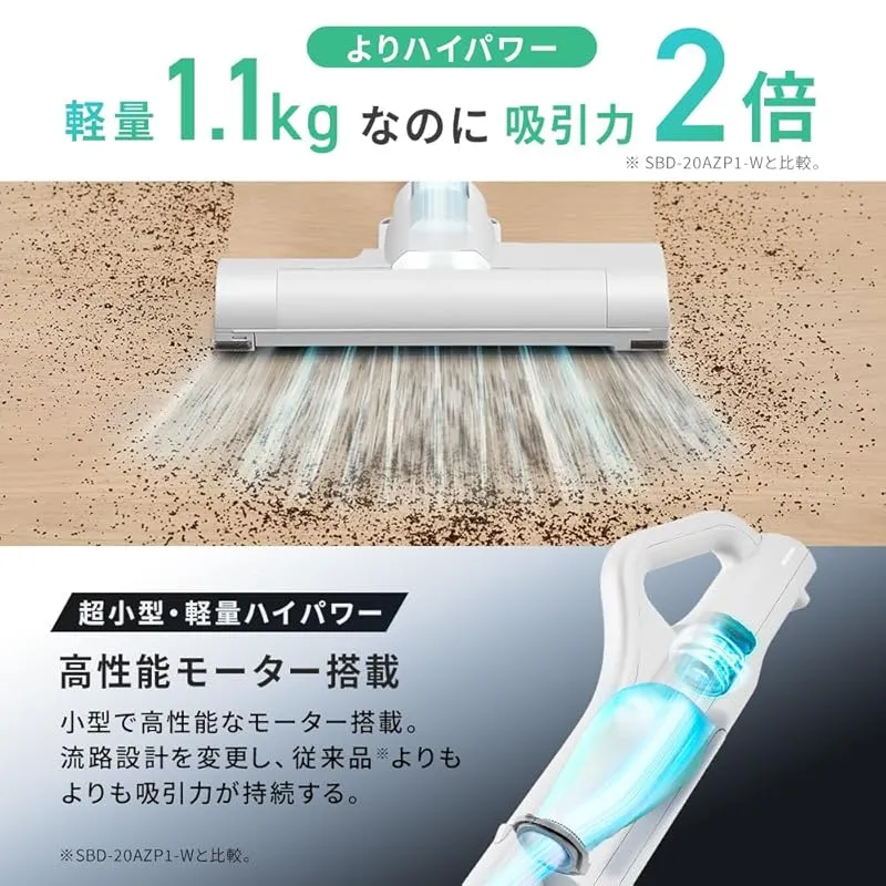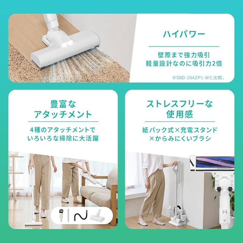 【商品概要】 吸引力2倍(※)を実現した、充電式スティッククリーナー[紙パック式]です。(※SBD-20AZP1-Wと比較。アイリスオーヤマ調べ。)小型で高性能なモーターを搭載しているので、軽くても強力な吸引力でしっかり吸い込みます。Amazon.co.jp限定のアタッチメントセット付属モデルです。 きわまでヘッド[ダブルエッジ構造:ヘッド両端に付いた斜めのリブ]で、壁際などのゴミも逃さず集めて吸引します。 隠れたゴミを見逃さない[W機能:LED/ほこり感知センサー]を搭載しています。[LED:ヘッドライトで床を照らして、ゴミを浮かび上がらせます。][ほこり感知センサー:ゴミの量をセンサーで感知して、キレイを見える化します。また自動モードで運転時、吸引力を自動調整します。] 充電スタンド付きなので、お掃除が終わったらスタンドに置くだけで充電でき、アタッチメントも収納できます。