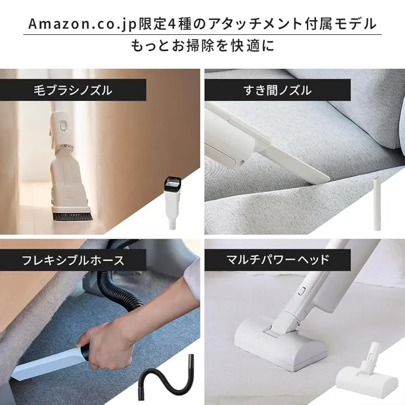 ◆種類豊富な4種のアタッチメント付き 付属のアタッチメントを使えば、いろいろな掃除に大活躍。スタンドにはすべてのパーツが収納できます。[すき間ノズル:お掃除しにくいすき間などに。軽量+充電式だから、車の掃除にも◎。][マルチパワーヘッド:布団やソファなど、布製品のお掃除に。][毛ブラシノズル:エアコンのフィルターやサッシなどのお掃除に。][フレキシブルホース:手が届きにくい狭いスペースのお掃除に。]※交換用ダストパックは透明の袋に封入してお届けいたします。