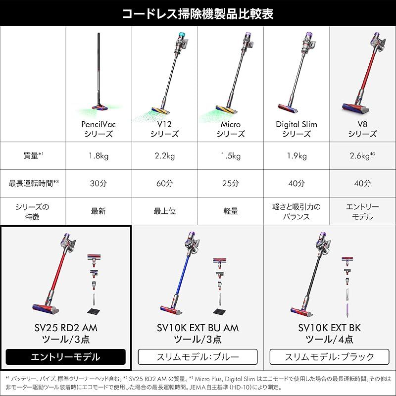 【変わらないパワフルな吸引力。ダイソン エントリーモデル。】 製造元:Dyson(ダイソン) 商品番号:SV25 RD2 AM 発売日:2024年12月10日 商品内容:通常品 色:Silver/Silver/Red 商品タイプ:1)V8: エントリーモデル