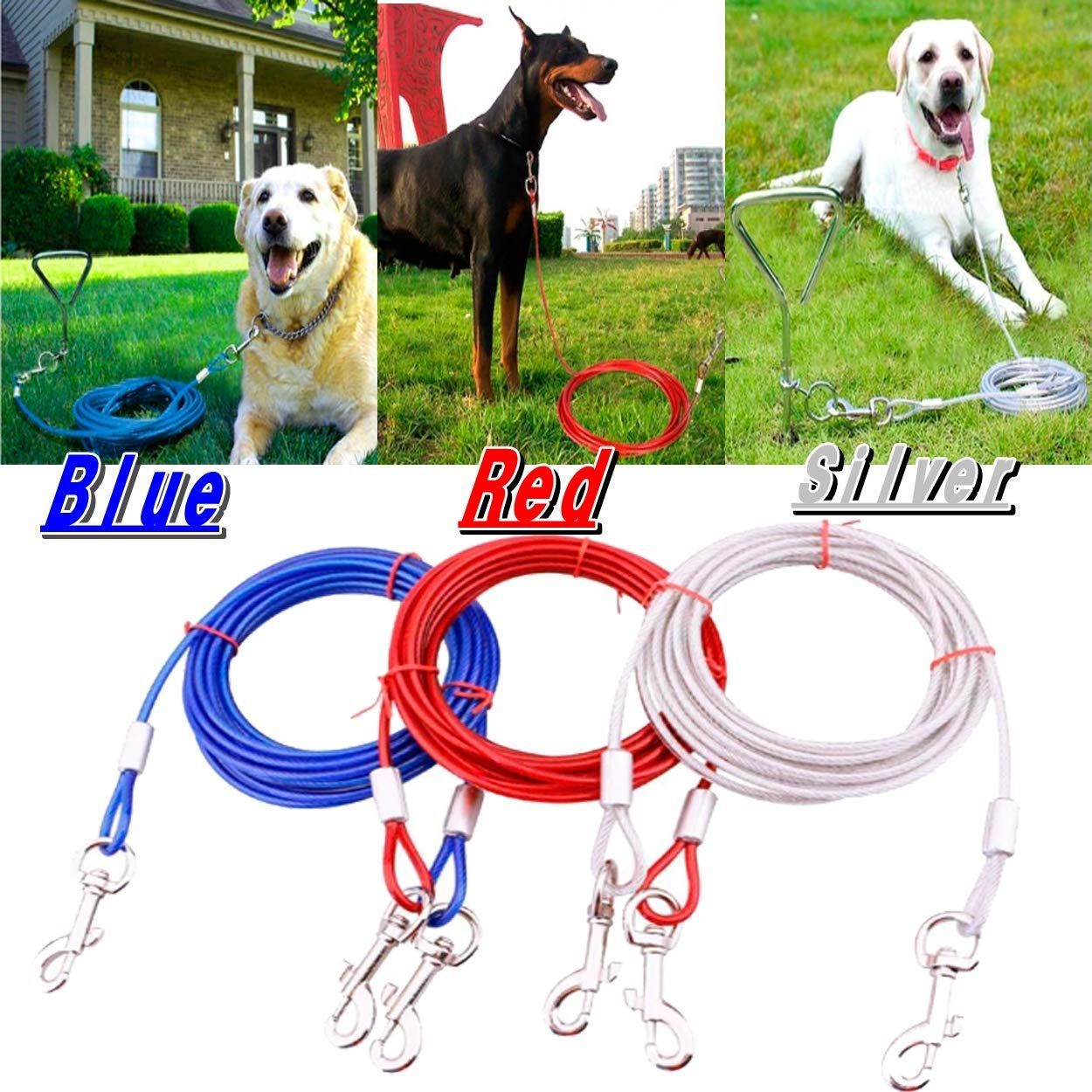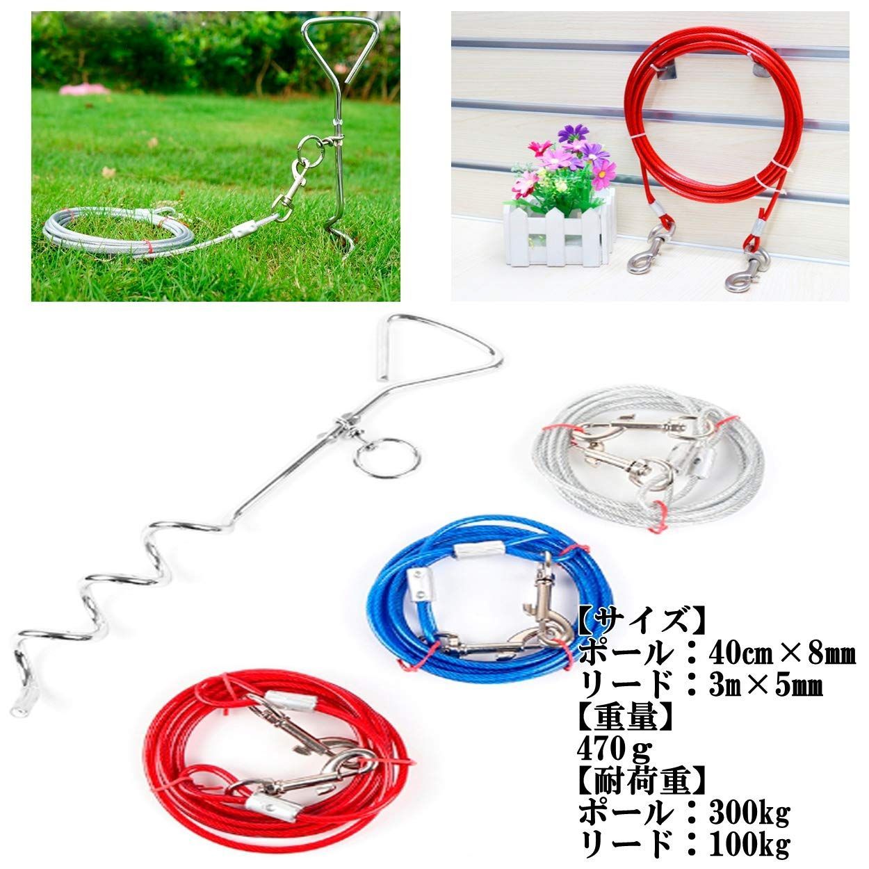 埋め込み式の小型・中型犬用 係留ステッキ&ワイヤーリードの2点セットです。ブルー・シルバー・レッドの3カラーをご用意しました。