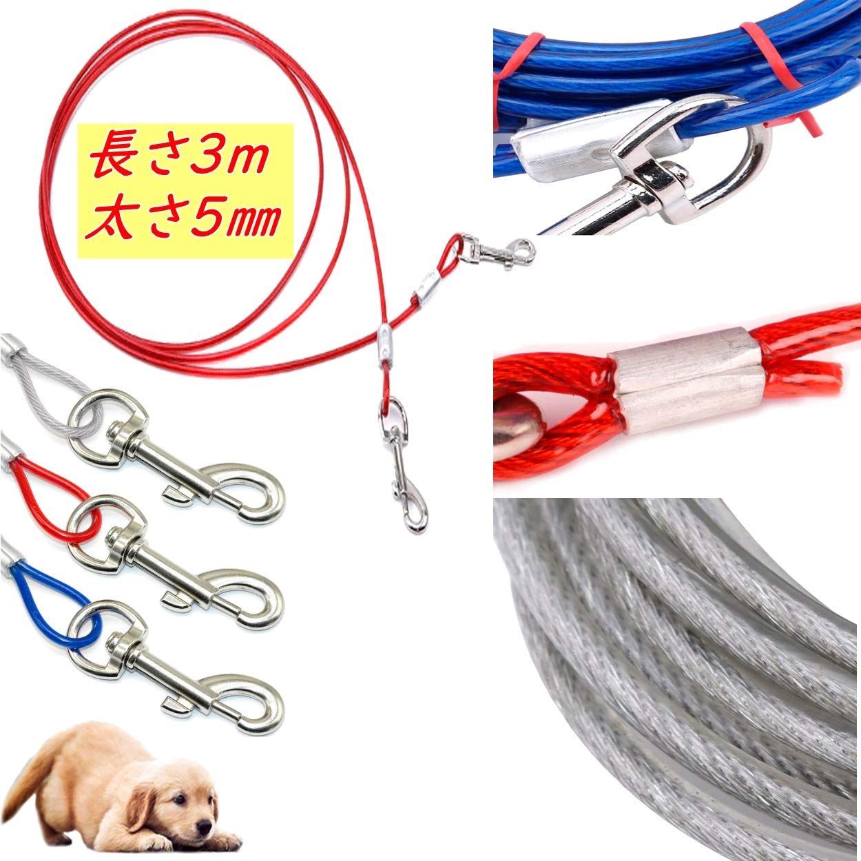 長さ3m、太さ5㎜のワイヤーリードは両端がフックとなっているので、お手持ちのリードの延長用としてもお使いいただけます。