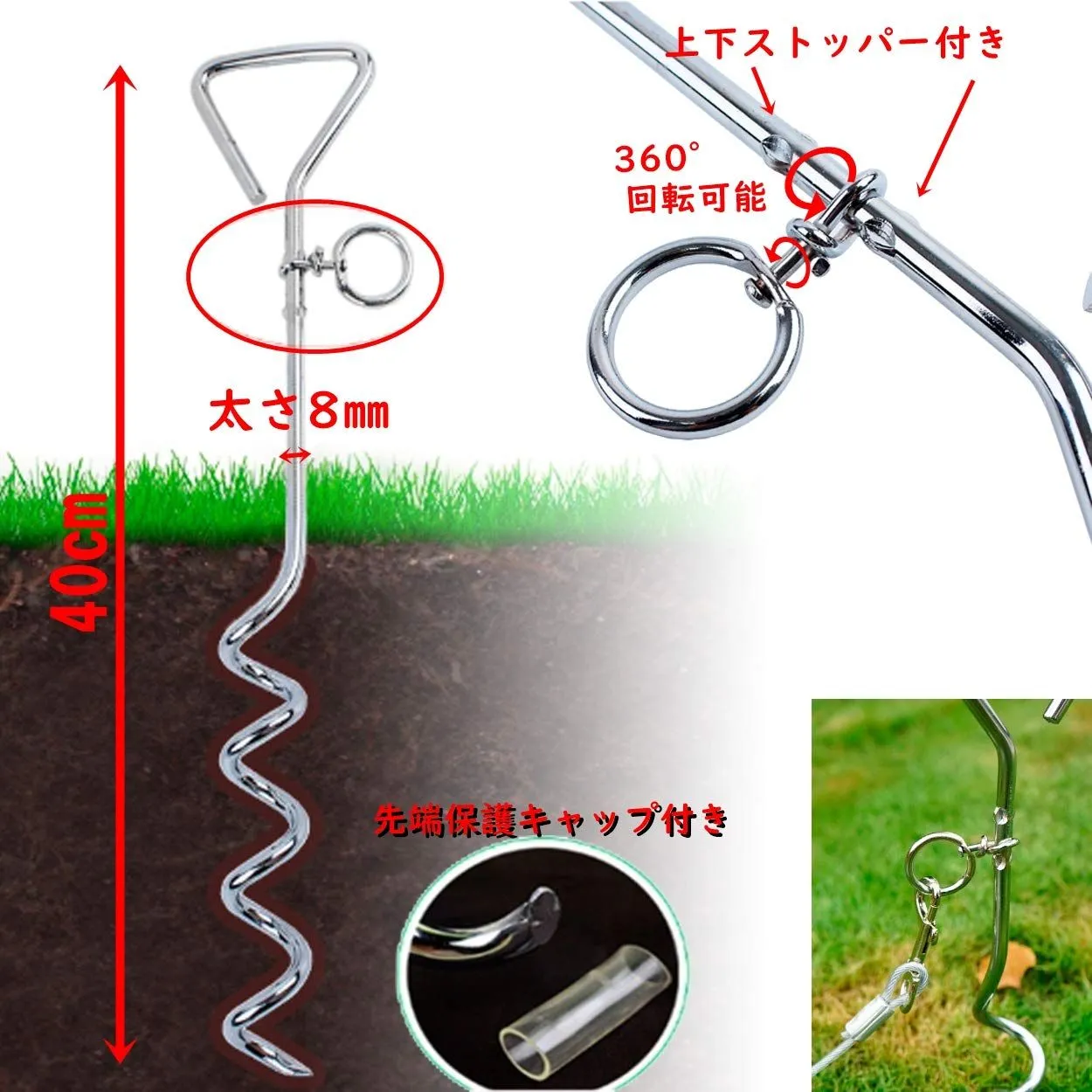 係留ステッキはドリルで埋め込むタイプとなっており、軽量で取り付け簡単。360°ワンちゃんが動き回れる回転フックとなっており、広い公園やドッグランなどで一緒にボール遊びなどがお楽しみいただけます。
