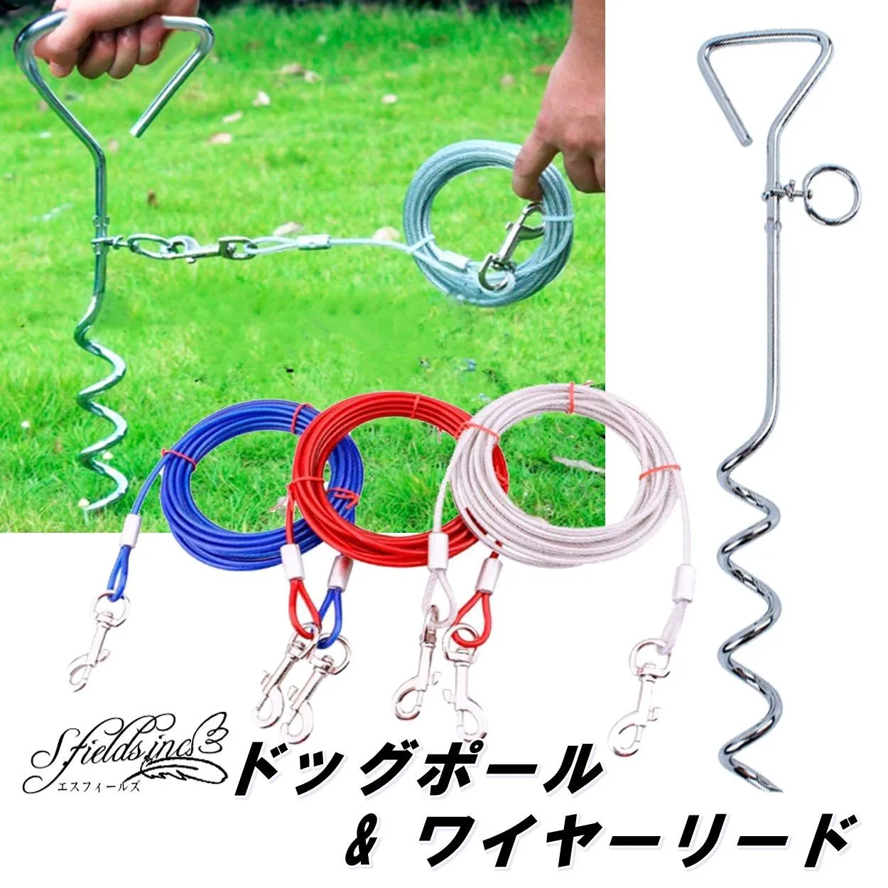 公園などのお散歩や、アウトドアキャンプ、BBQなど、屋外で一時的に係留しておくための係留ポールとスチールワイヤーロープです。