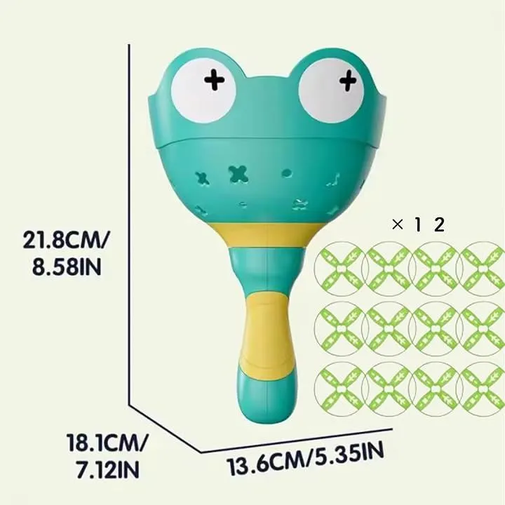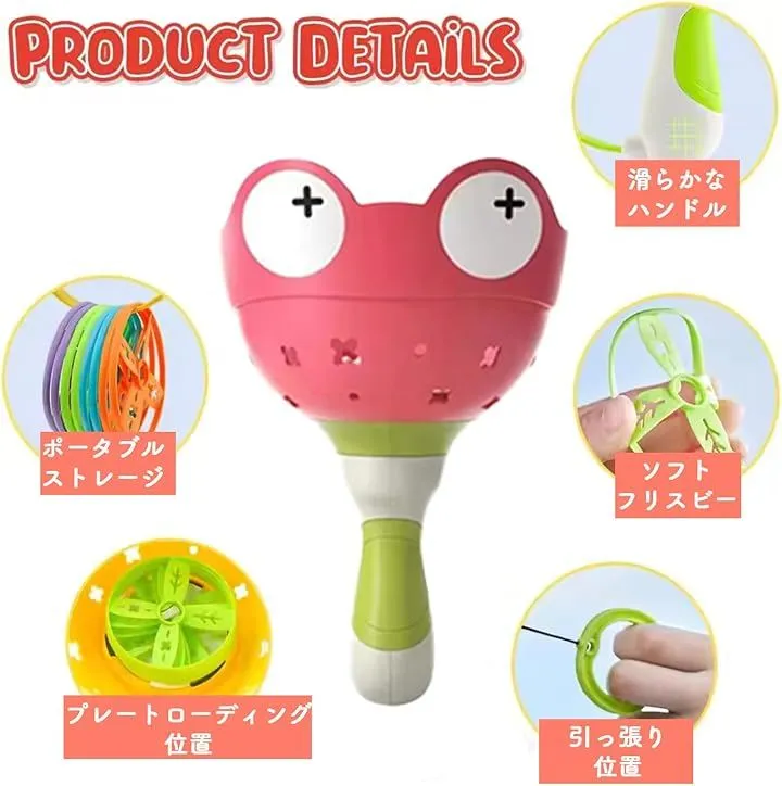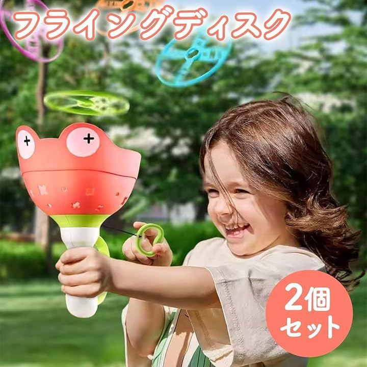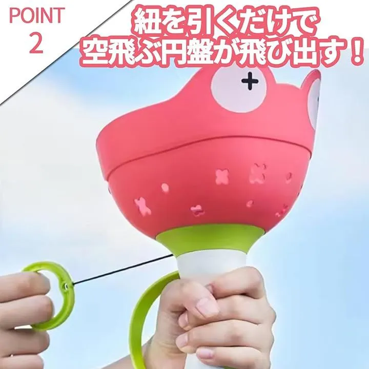 紐を引くだけで空飛ぶ円盤(フライングソーサー)が飛び出す。発射機付きの子供用フライングディスク2個セット。