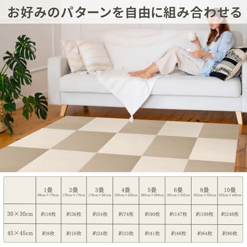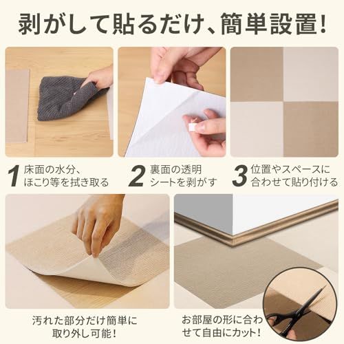 【ハサミだけで設置出来る、自由カスタマイズ】 タイルマットは部屋のスペースに合わせて必要な枚数を組み合わせるだけで設置完了、接着剤などは一切いりません。さらに、ハサミを使って簡単にカスタマイズができ、部屋の隅や壁際などの場所でもぴったり敷き詰めることができます。様々な色バリエーションがあり、ご自身の好みに合わせて自由に組み合わせましょう。