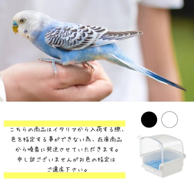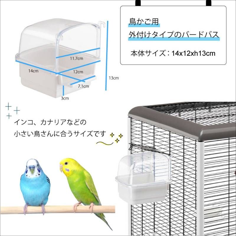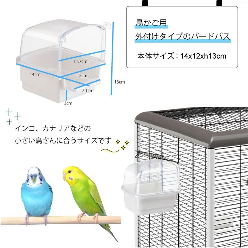 【製品の特徴】 ・クリアカバーで飛び散り防止: 透明な上部カバーが水飛沫をしっかり受け止めるため、ケージ周りが水浸しになるのを防ぎます。 ・ケージに簡単取り付け: フック式で、鳥かごの出入り口などにサッと引っ掛けるだけで簡単に設置できます。 ・お手入れラクラク: 上部カバーと下部トレイは取り外し可能なので、丸洗いができていつでも清潔を保てます。 ・中の様子が見える: 透明度が高いプラスチック製なので、小鳥が気持ちよさそうに水浴びをする可愛い姿を外からしっかり観察できます。 ーーーーーーーーーーーーーーーーーーーーーーーーー