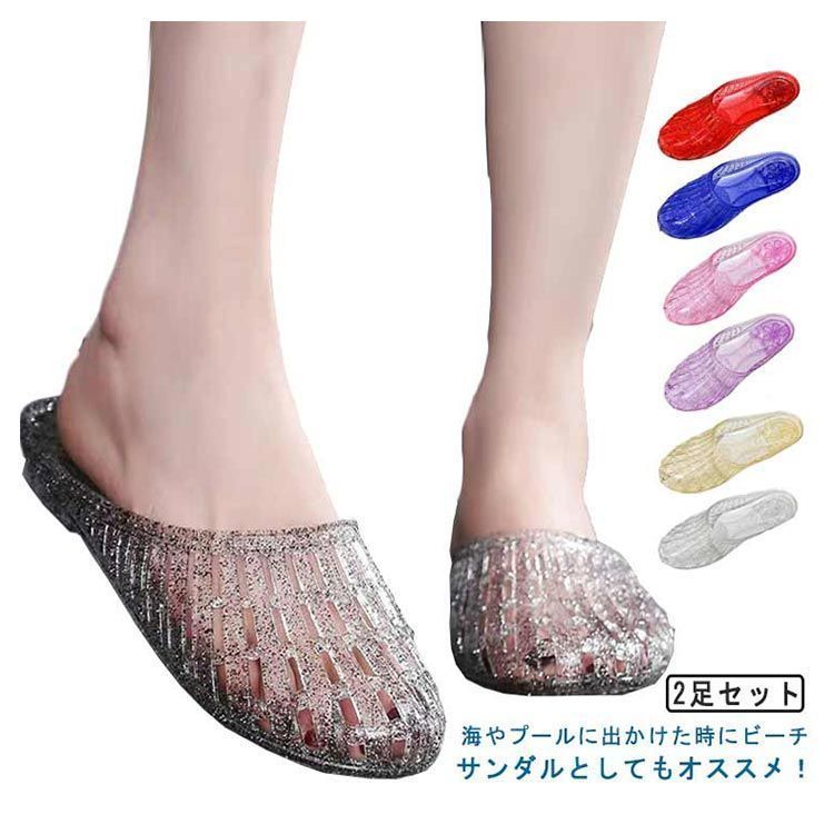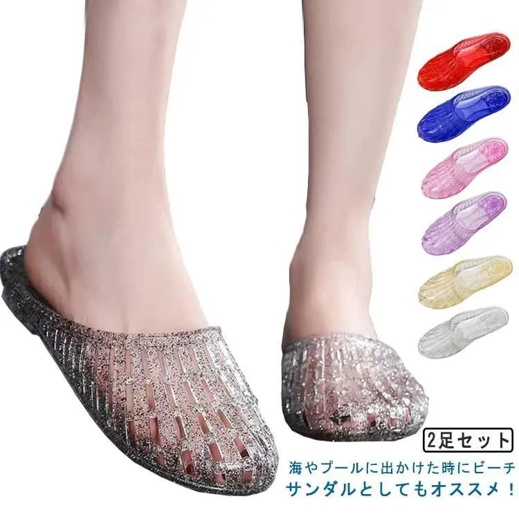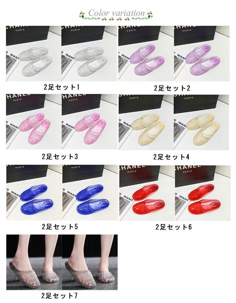 ■こちらの商品は沖縄・離島は配送料が異なります。 ご購入前にお知らせください。 お住まいの地域に合わせた専用ページを作成いたします。 サイズ 36 / 37 / 38 / 39 / 40 / 41 サイズ詳細 (実測値) 36:約23cm 37:約23.5cm 38:約24cm 39:約24.5cm 40:約25.0cm 41:約25.5cm ※手作業による実測のため、若干の誤差が生じる場合がございます。 素材 PVC カラー (2足セット) セット1 / セット2 / セット3 / セット4 / セット5 / セット6 / セット7 --- 商品の特徴 - 履き心地抜群:履いた瞬間からふわっとやわらか。爪先からかかとまで柔らかい素材が足を優しく包み込みます。 - 機能性:滑りにくく、歩きやすく、長時間履いても疲れにくい設計です。 - デザイン:今季のトレンドを取り入れた、可愛すぎず大人っぽい印象のキラキラぺたんこ。 - シーン対応力:カジュアルからキレイめコーディネートまで幅広く合わせられます。さっと履けるので、コンビニなどちょっとしたお出かけにも便利。 - 多用途:海やプールでのビーチサンダルとしてもおすすめです。お子様の送り迎えなどで忙しい方にも好評です。 プラス配送料の目安 沖縄・離島 +2,000円