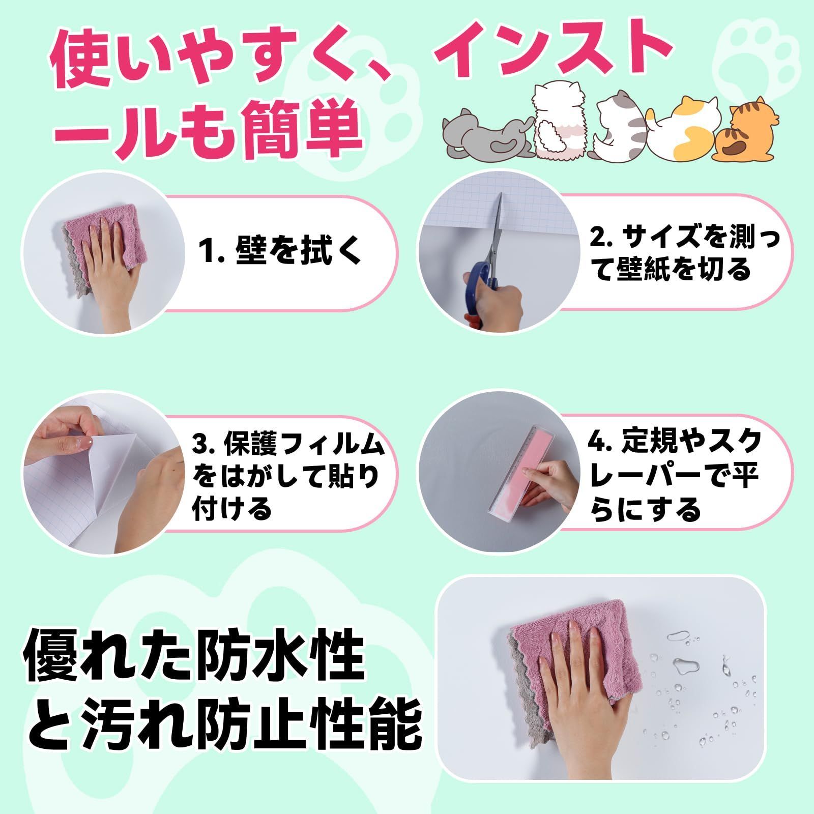 【材質】:壁紙保護シールは高強化PVC素材を採用し、厚手で耐久性があり、無毒で環境に優しい素材で、ペットが舐めても心配ありません! ^ω^