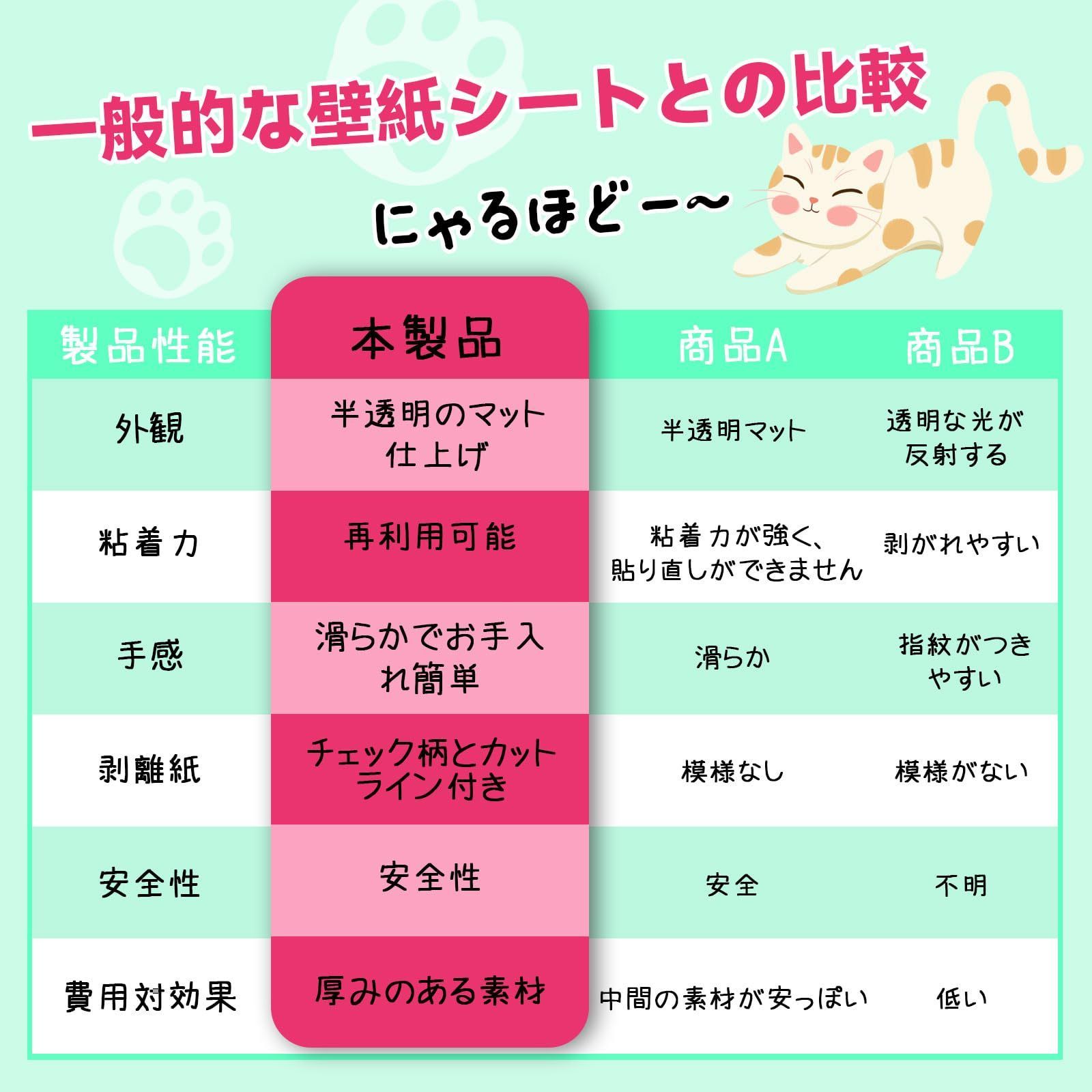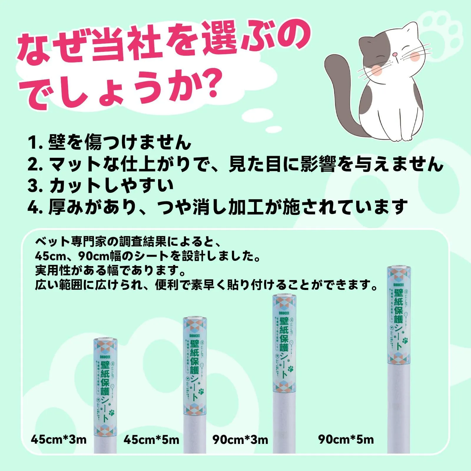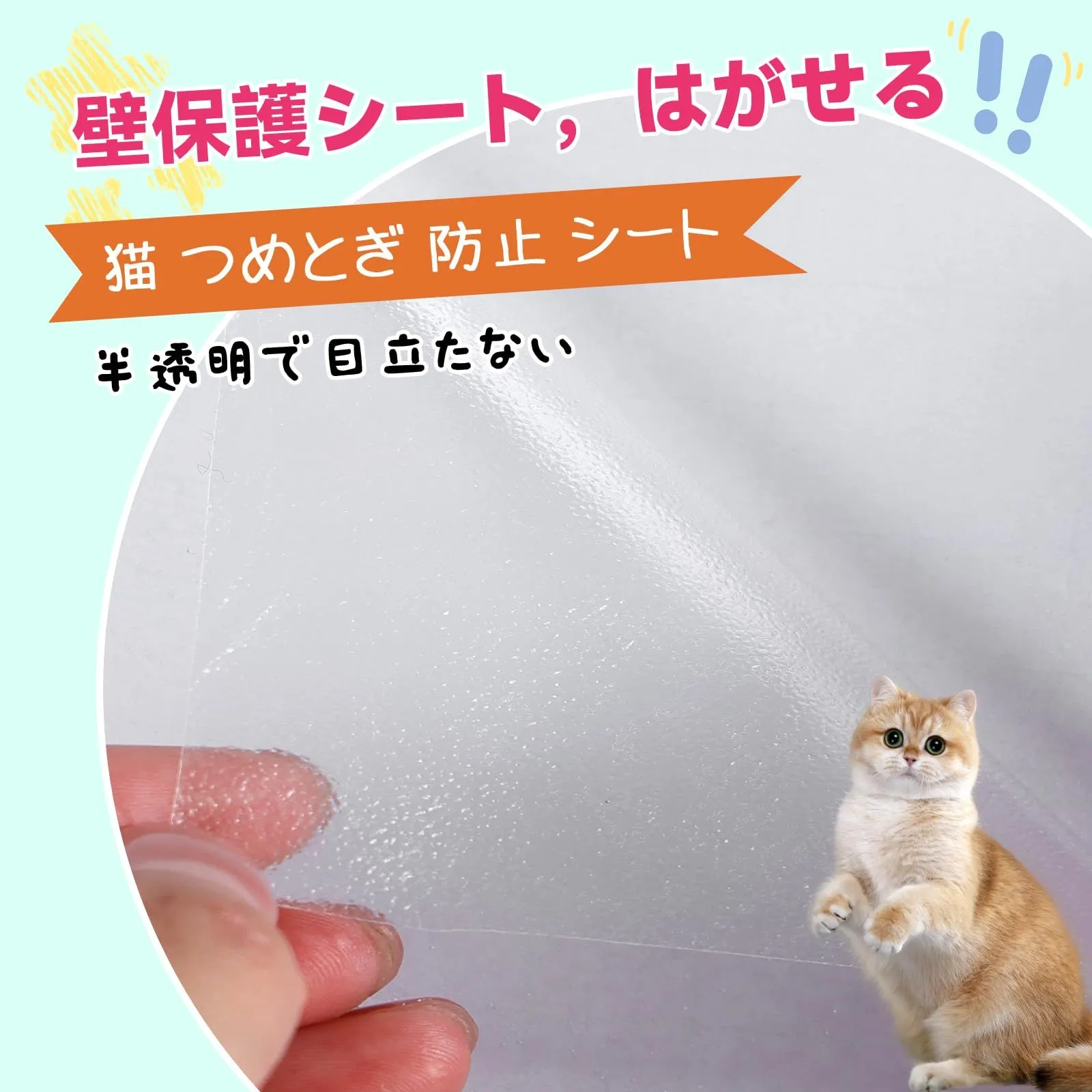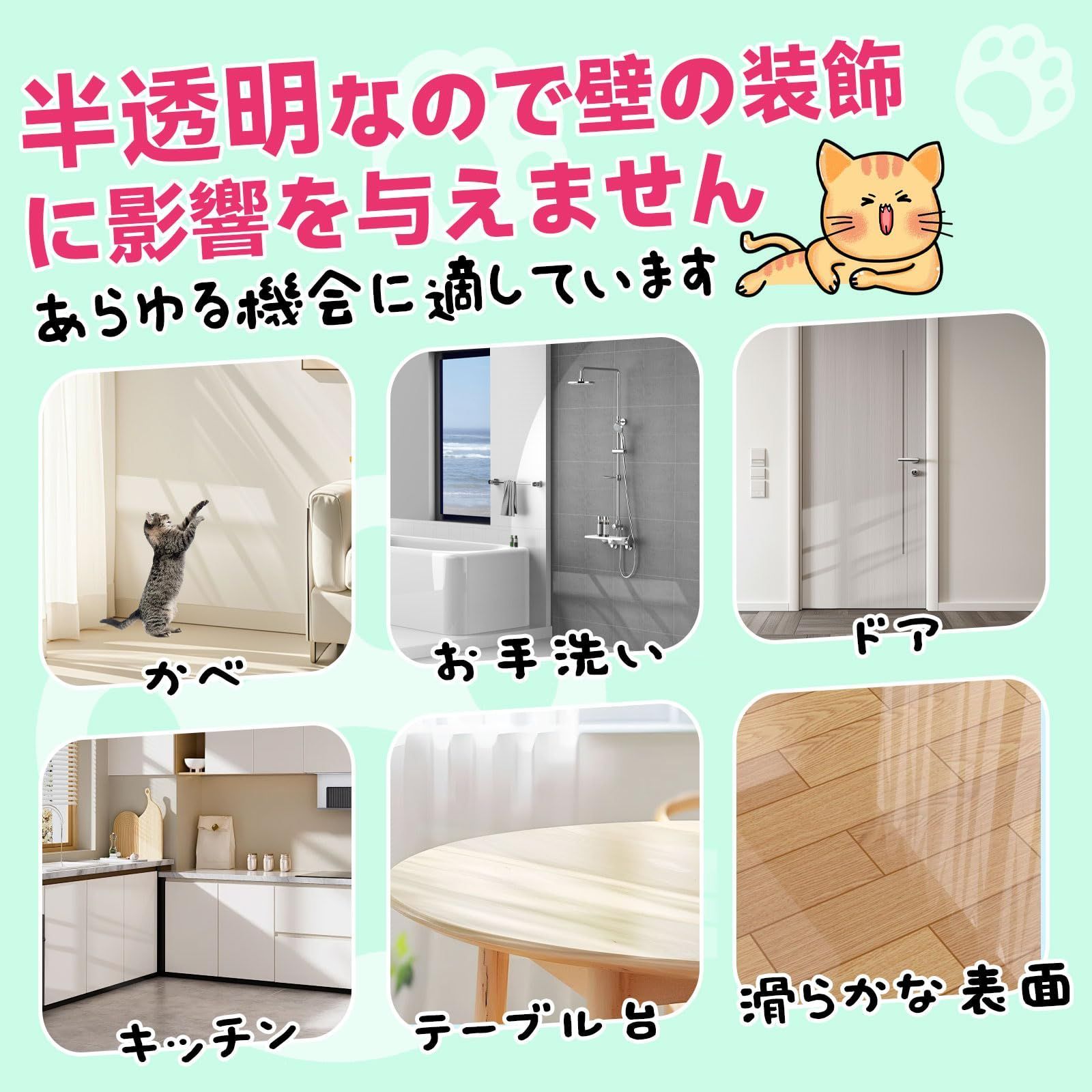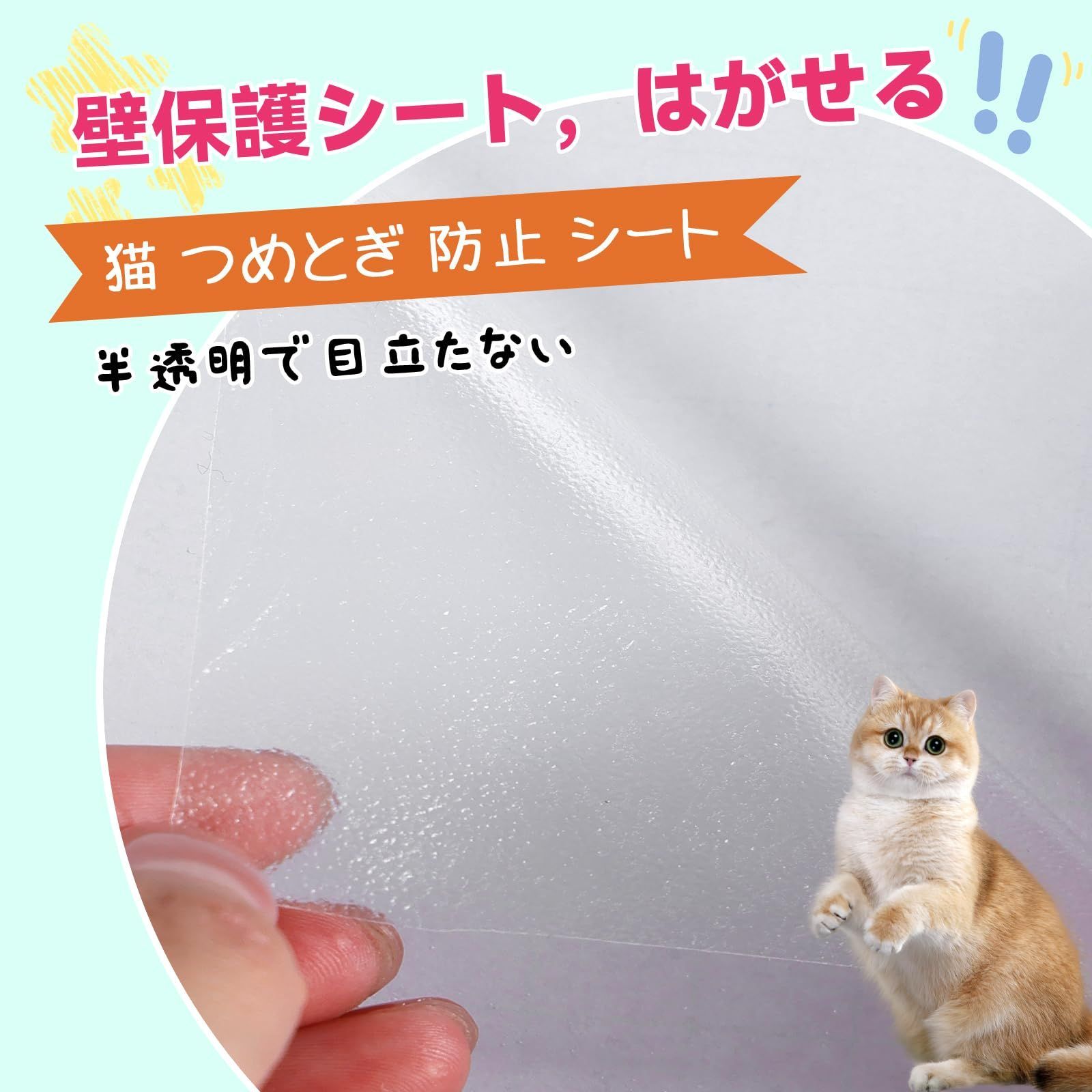 【粘度】:粘度に採用されている弱粘度は、はがしやすく、壁を傷つけないのがポイントです。また、猫の爪が壁紙保護シートを傷つけた場合には、簡単に交換することができます。 ^ω^