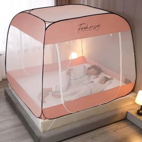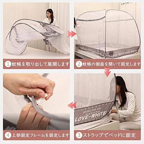 【折りたたみ式】従来の吊り下げるタイプの蚊帳とは違い、xinxin-home蚊帳は折りたたみ式デザインを採用して、簡単に組み立てることが出来るので、女性でも楽々です。収納袋から取り出して弾性バンドを外すだけ、パッと自動的に広がるワンタッチ式のデザインで、女性一人でも簡単に組み立てられます。フレームは強弾性スチールワイヤーなので、シーズンオフや収納の時、四つの輪に折り畳んで収納袋に入れます。とても軽いので、組み立てたまま移動することも可能です。