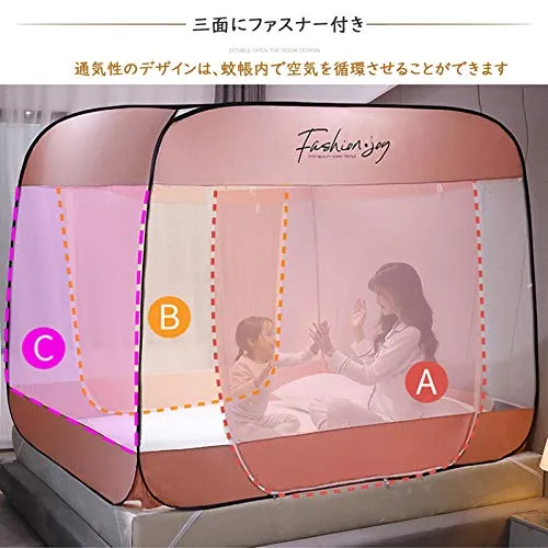 【細目なメッシュ素材】風を通して害虫は通さない細かなメッシュ素材を採用、細かいネットが蚊の侵入を防ぎます。これなら薬剤も使わなくて良いので小さなお子さんがいるご家庭でも安心です。柔らかいな色がお部屋の雰囲気に合わせやすく、長年にわたってご使用いただけます。三面にファスナー付き、とっても便利です。通気性のデザインは、蚊帳内で空気を循環させることができます。