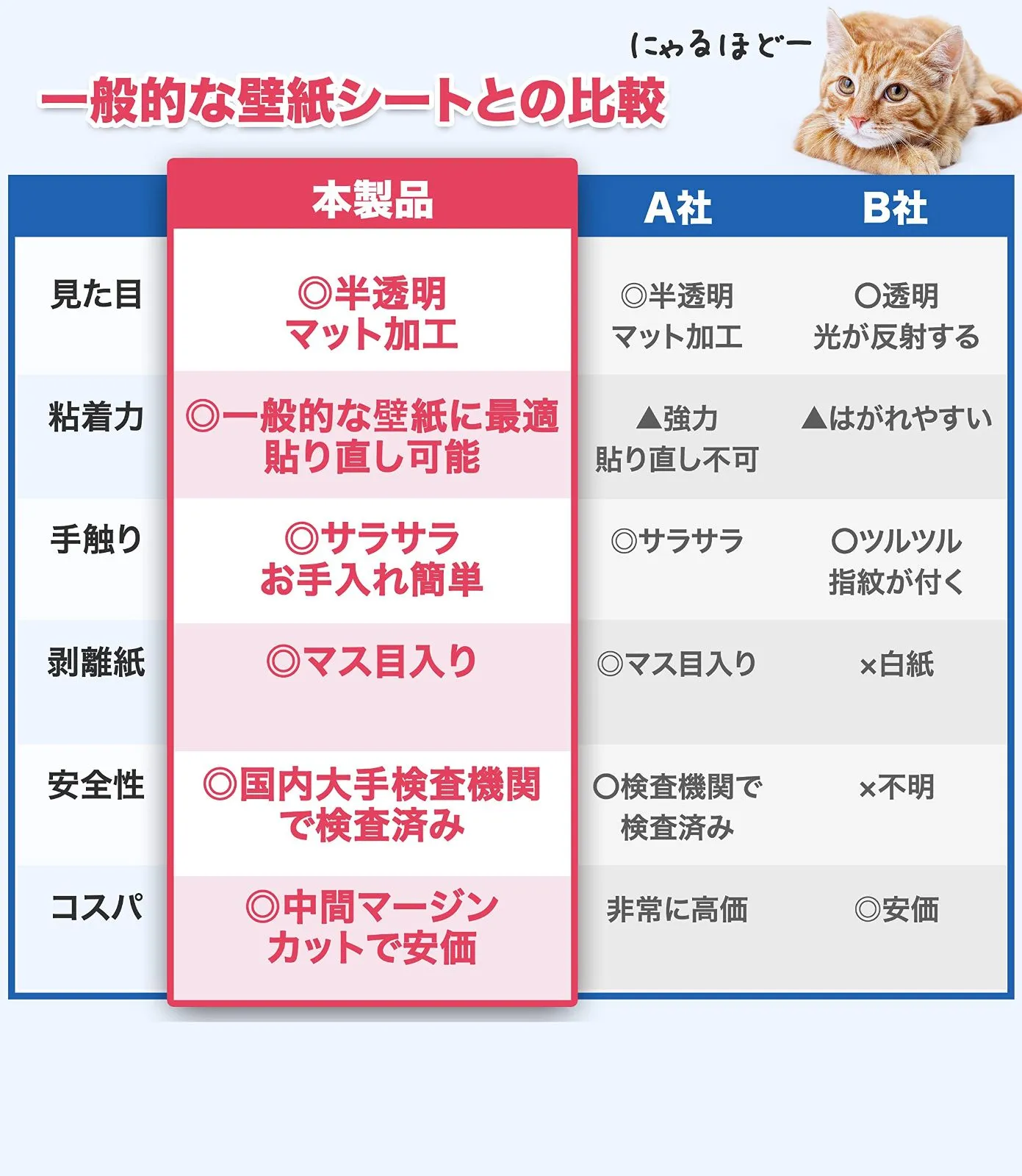 【お客様のご意見から粘着力をアップしました】現在の日本で多く使用されている壁紙に最適な粘着力を研究しました。 従来の自社製品よりやや強めに仕上げています。すでに傷がついていたり、古くなった壁紙ですと剥がれやすくなりますのでご了承下さい。剥がせるので賃貸でも安心です。 材質によっては時間経過により若干ノリでべたつく場合が有りますが消しゴムで軽くこすると簡単にとることが出来ます。