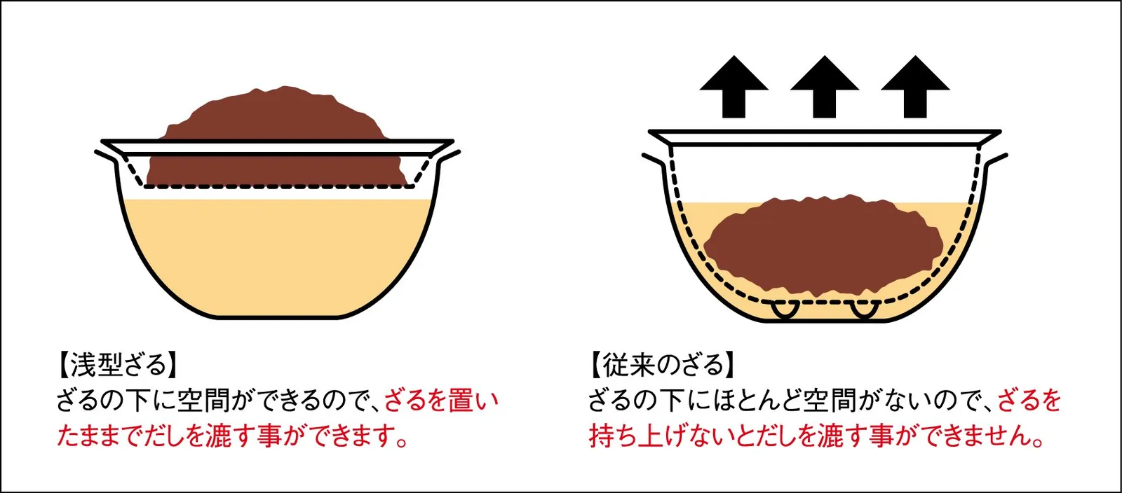同サイズのボウルと合わせて使うことで、格段に料理しやすくなります。 四人家族のお味噌汁のお出汁なら中サイズが便利です。 漉した出汁がたっぷりボウルに受けられるよう浅型にしたので、鰹節や煮干しが出汁に浸かることがありません。 ・サイズは大(27cm)、中(21cm)、小(15cm)の3種類。 ・耐久性に優れた18-8ステンレス鋼を使用。 ・丈夫な綾織を採用して網を支えるワイヤーを無くしたので、汚れが溜まりにくく洗いやすいので清潔を保てます。 ・縁は一枚のステンレス板をくり抜いて作ったので、つなぎ目がなく洗いやすいです。
