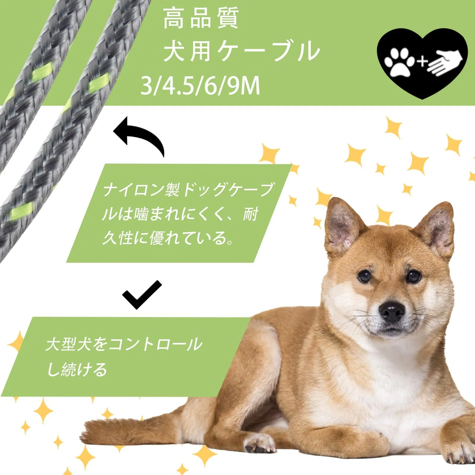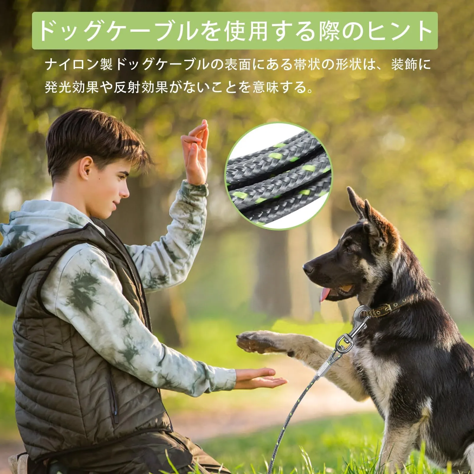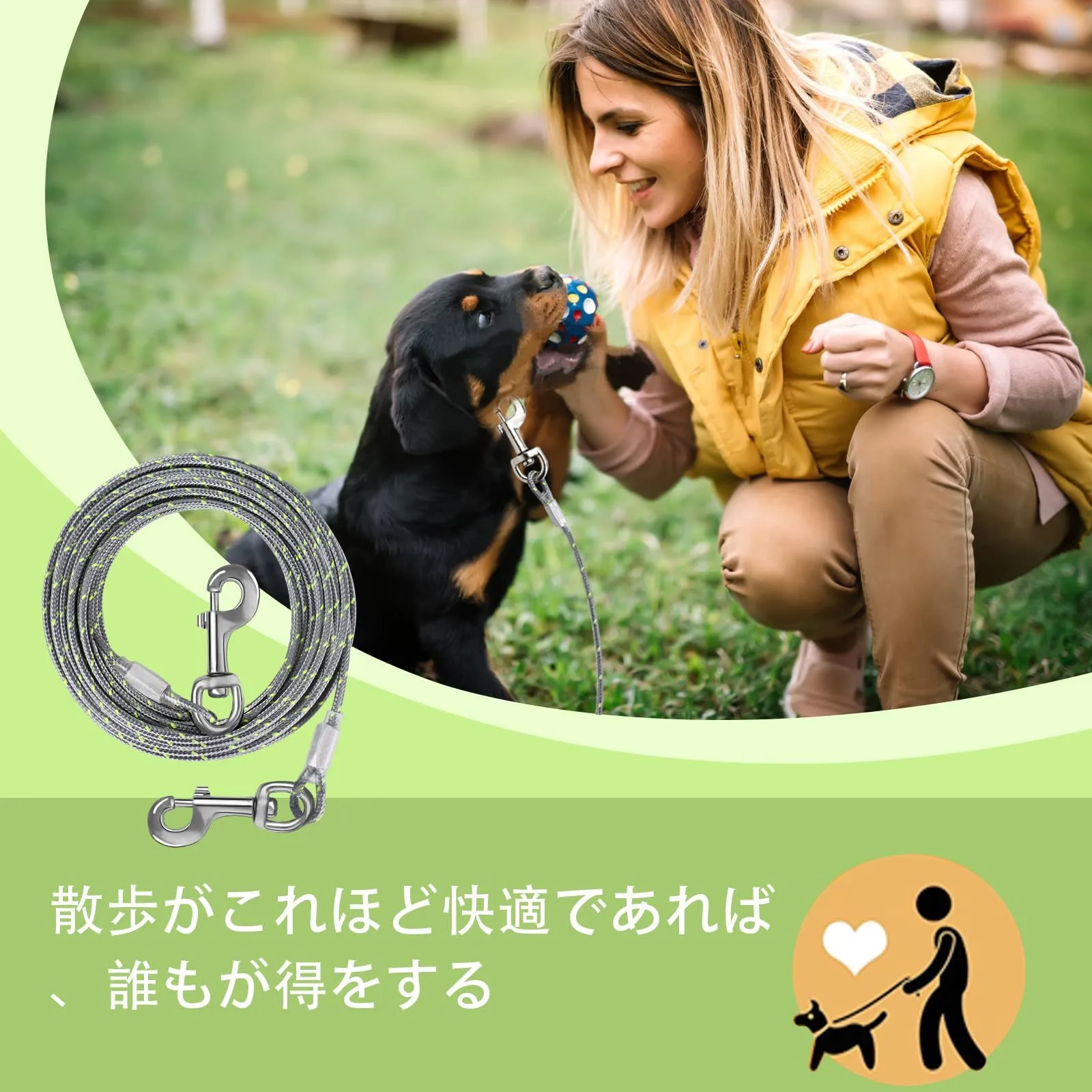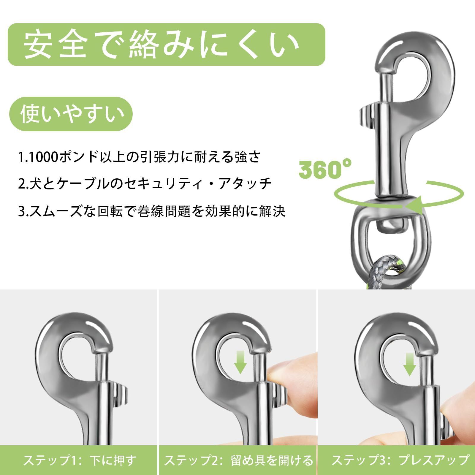 アドバンスド・クリップ:回転クリップは360°回転することができ、あなたの犬が絡まることなく移動するためのより多くのスペースを提供します。また、ペットがケーブルから外れて危険な目に遭うことも防げます。
