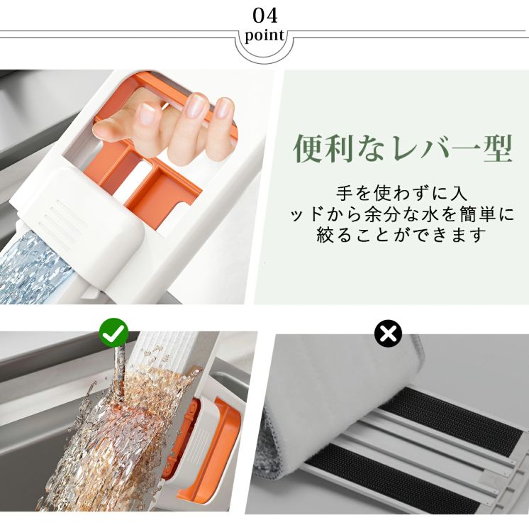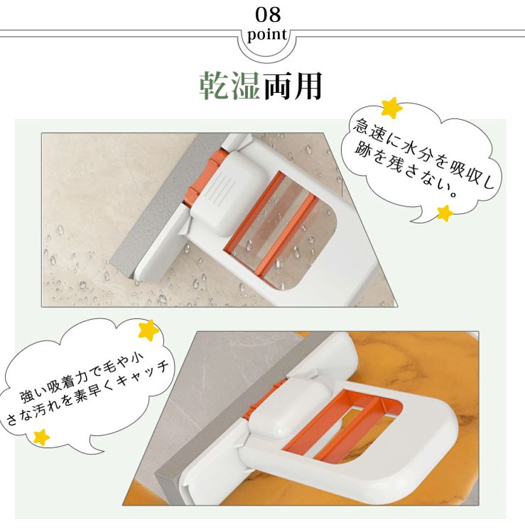 ◆ 使用方法 1. 水に濡らして柔らかくしてから使用します。 2. レバーを押して引くだけで水を簡単に絞れます。 3. 壁角や隙間、床面を軽くなぞるだけで汚れをしっかりキャッチ。