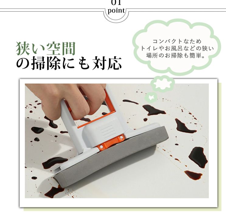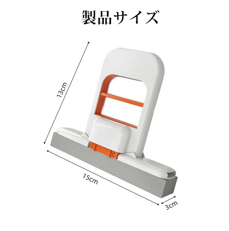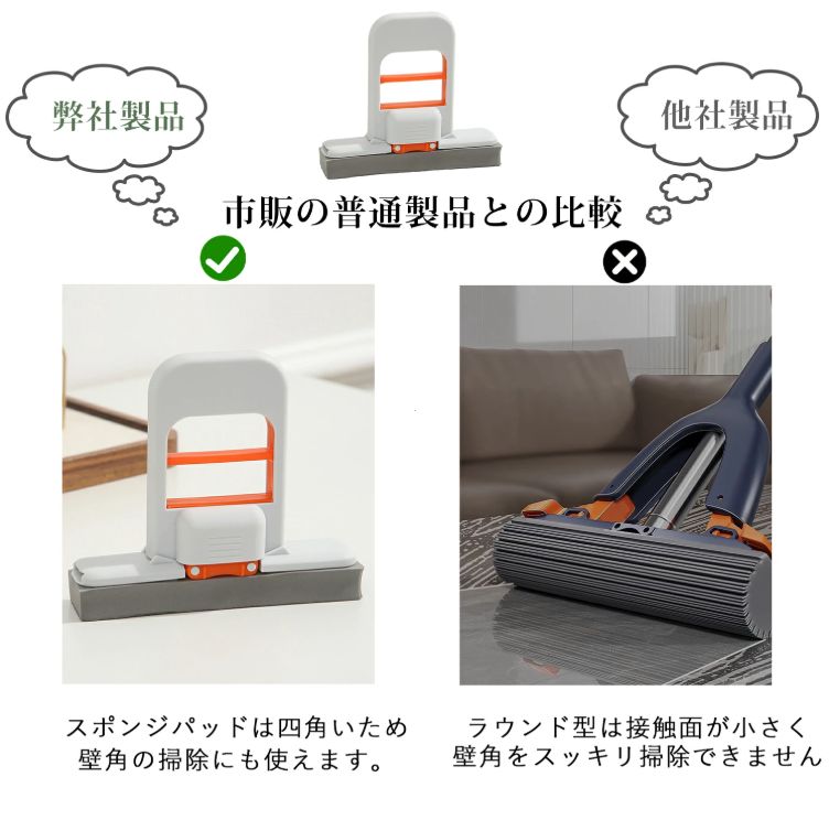 ◆ 使用方法 1. 水に濡らして柔らかくしてから使用します。 2. レバーを押して引くだけで水を簡単に絞れます。 3. 壁角や隙間、床面を軽くなぞるだけで汚れをしっかりキャッチ。