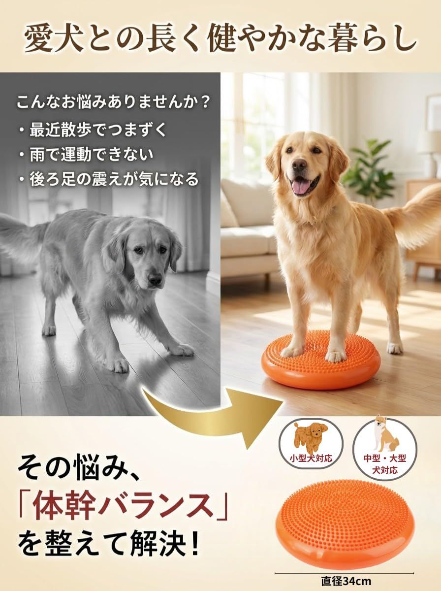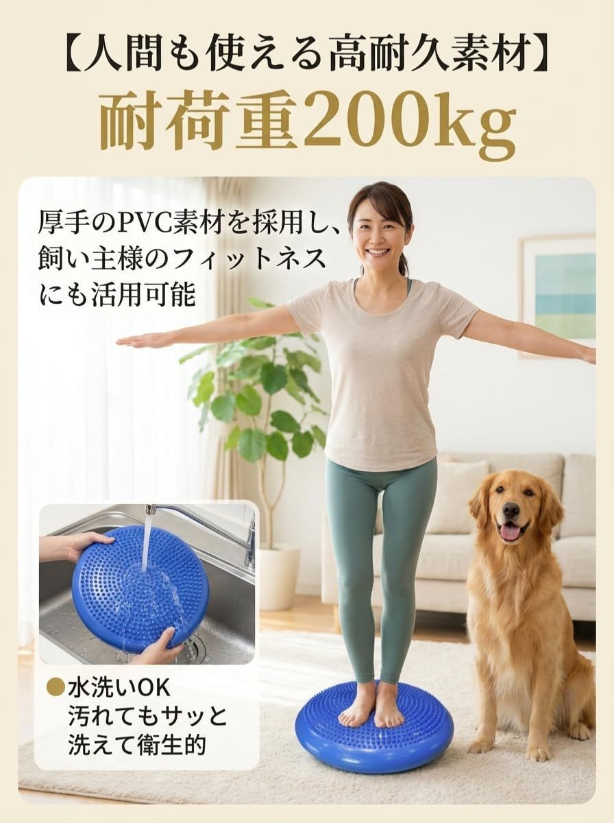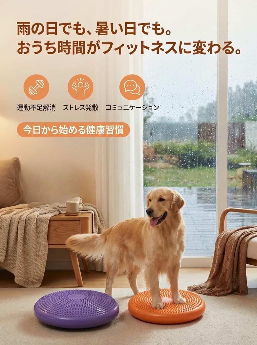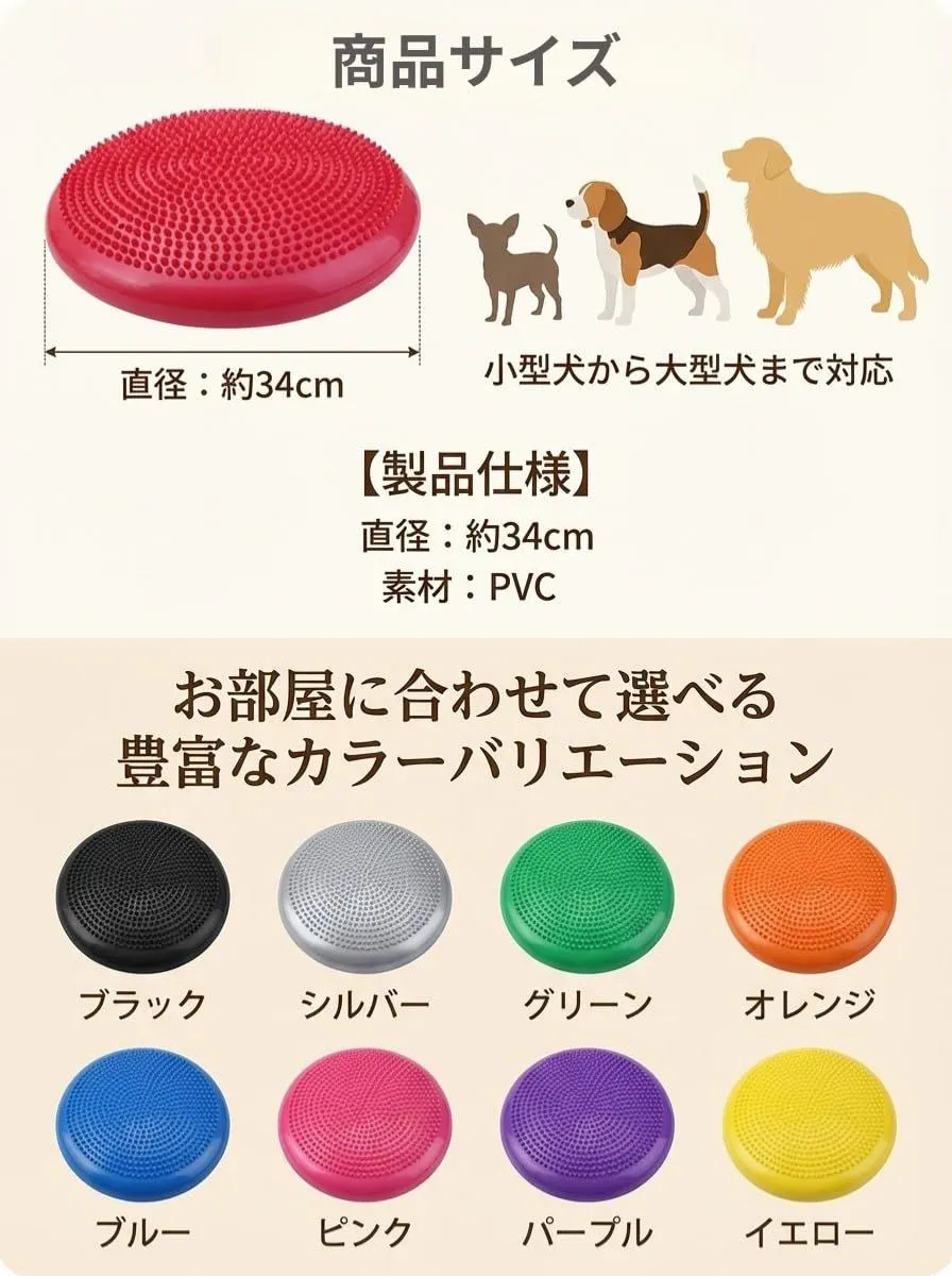 【円形タイプのバランスディスク】 円形のバランスディスクは、四方に均等に力がかかるため安定感があります。これにより、トレーニング初心者のワンちゃんでも安心して使用できます。特に、バランスボールに比べて転倒のリスクが少ないため、どんなワンちゃんでも安全にトレーニングを始められます。