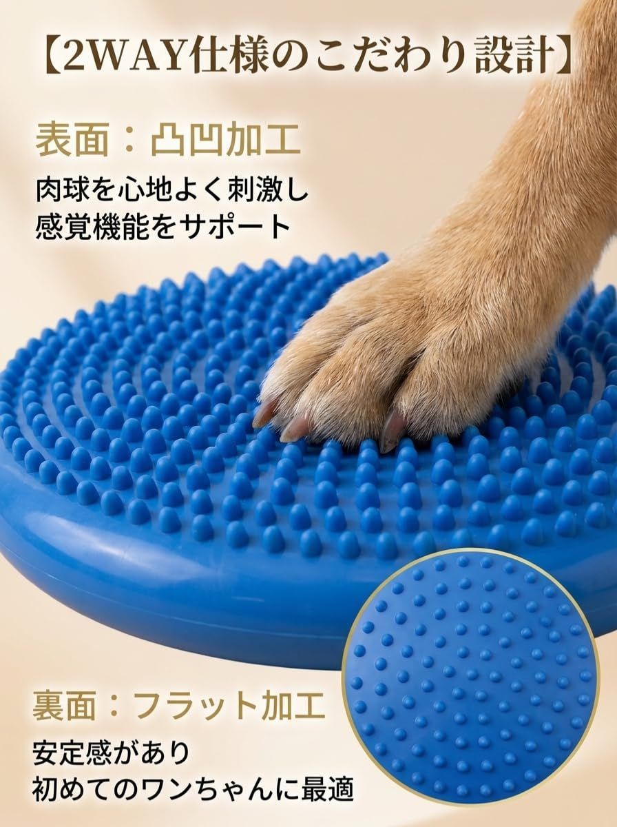 【両面タイプ&凸凹の特徴】 バランスディスクは両面使用可能で、それぞれ異なるトレーニング効果があります。一方の面には凸凹のポイントがあり、ワンちゃんの肉球を刺激します。期待できます。もう一方の面は滑らかで、より安定したトレーニングが可能です。