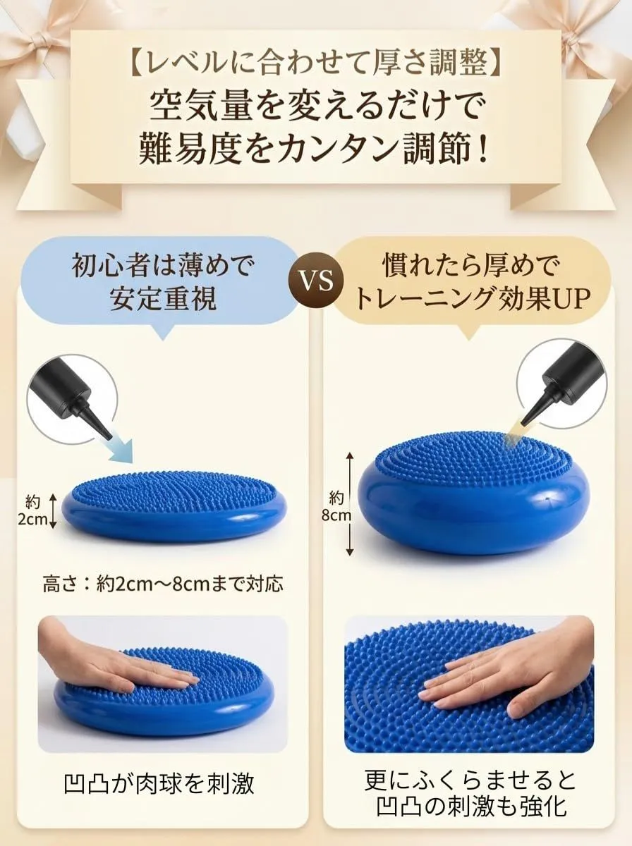 【厚さは2cmから8cmまで調節可能】 ディスク内の空気量を調整することで、厚さを2cmから8cmまで自由に変えることができます。これにより、初心者から上級者まで、ワンちゃんのトレーニングレベルに応じて最適な厚さでトレーニングを行うことができます。また、トレーニングの進行に応じて難易度を上げることができ、長期的な使用が可能です。