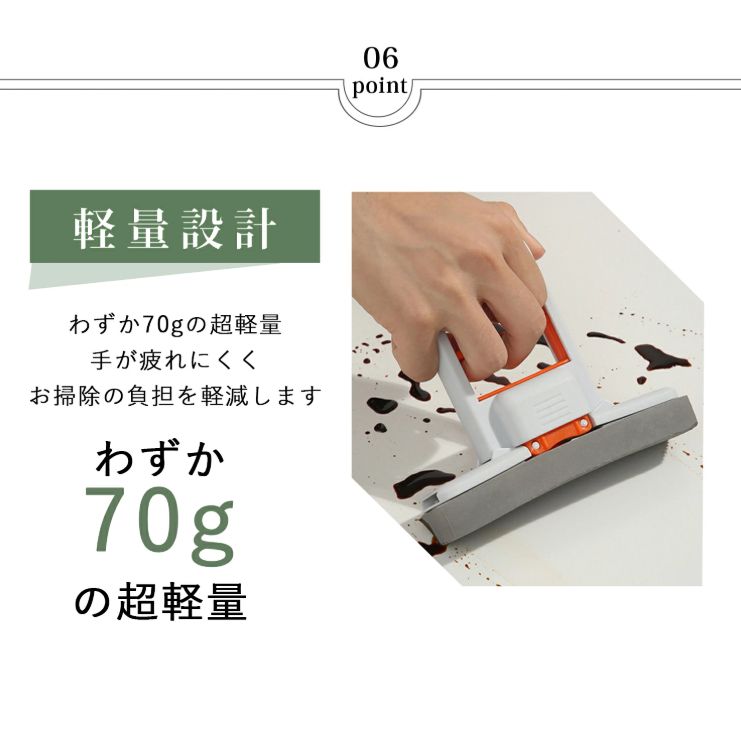 ◆ 商品特徴 🧽 隅々までラクラク掃除 コンパクト設計で、トイレやお風呂などの狭い空間もスッキリお掃除。壁角や隙間もキレイに! 💧 強力な吸水性 PVAスポンジ素材で水分を素早く吸収。窓の結露や浴室の水滴取りにも大活躍。 ✋ 片手で操作&簡単絞り レバー式で水を押して引くだけ!手を濡らさずにラクラク絞れて衛生的。 ⭐ 軽量&疲れにくい わずか70gの超軽量設計。長時間使っても手が疲れにくく、お掃除がもっと快適に。 🏠 収納便利&多用途 吊り下げ収納にも対応し、省スペースに片付け可能。乾湿両用で毎日の掃除に欠かせないアイテム。
