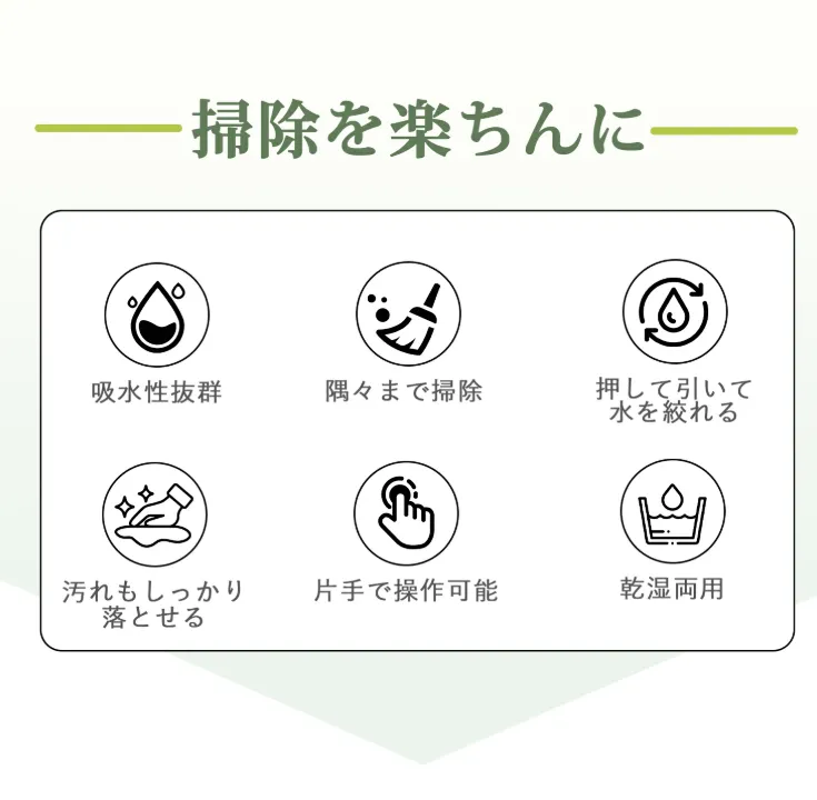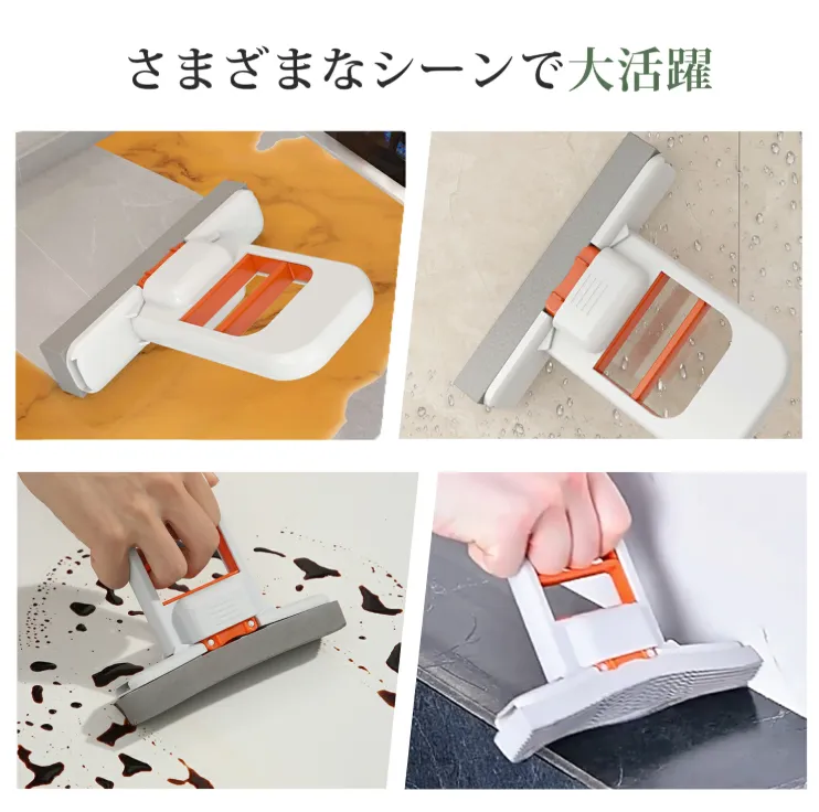 ◆ 使用方法 1. 水に濡らして柔らかくしてから使用します。 2. レバーを押して引くだけで水を簡単に絞れます。 3. 壁角や隙間、床面を軽くなぞるだけで汚れをしっかりキャッチ。