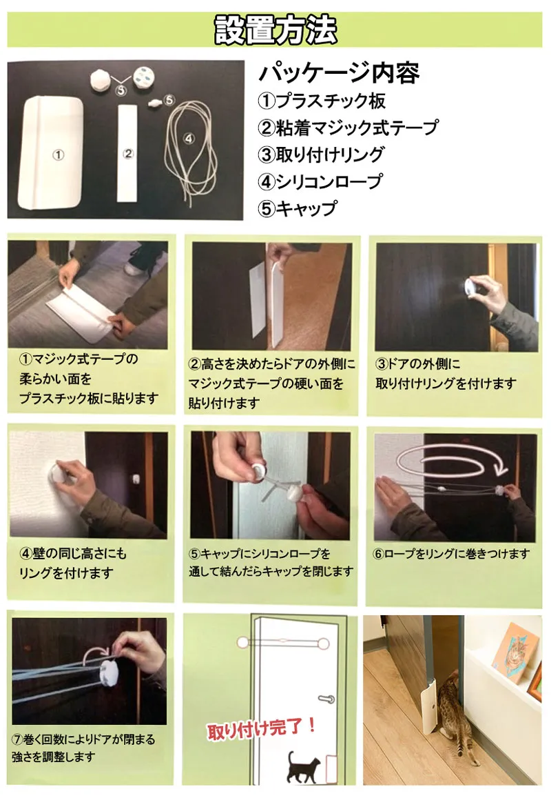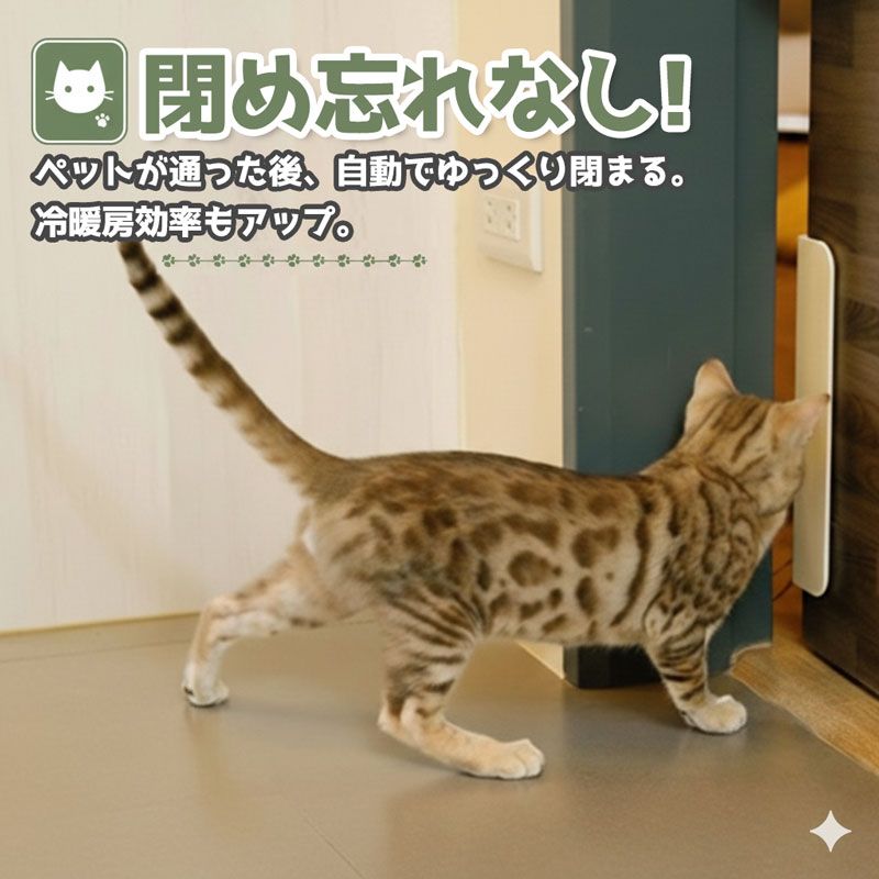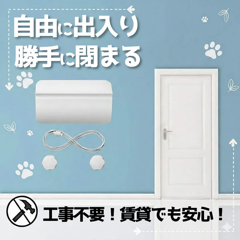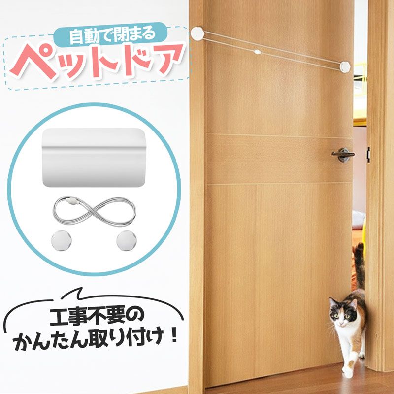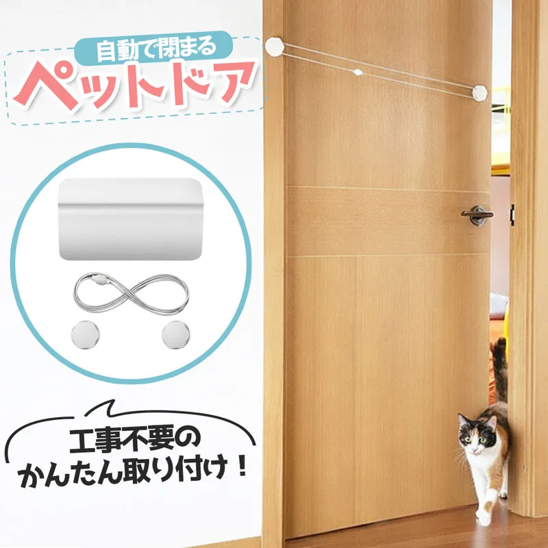 ペットドア 自動 閉まる 貼付 ペット出入口 勝手口 扉 猫 犬 室内用 ドア 閉じ込め防止 換気 後付け 工事不要 工具不要 賃貸 隙間 開け放し防止 ストッパー シリコン ロープ 固定 マジック式 冷暖房対策 引き戸 開き戸 キャット ドッグ ドア