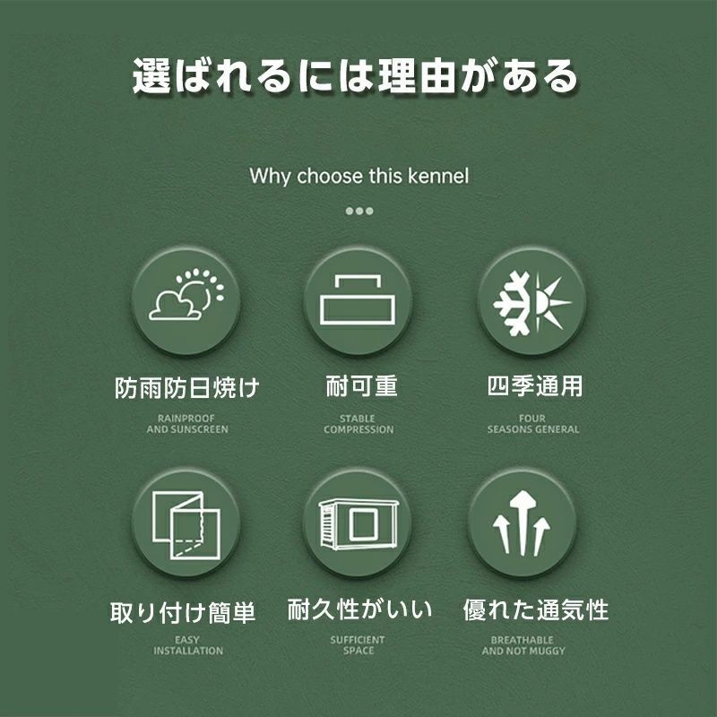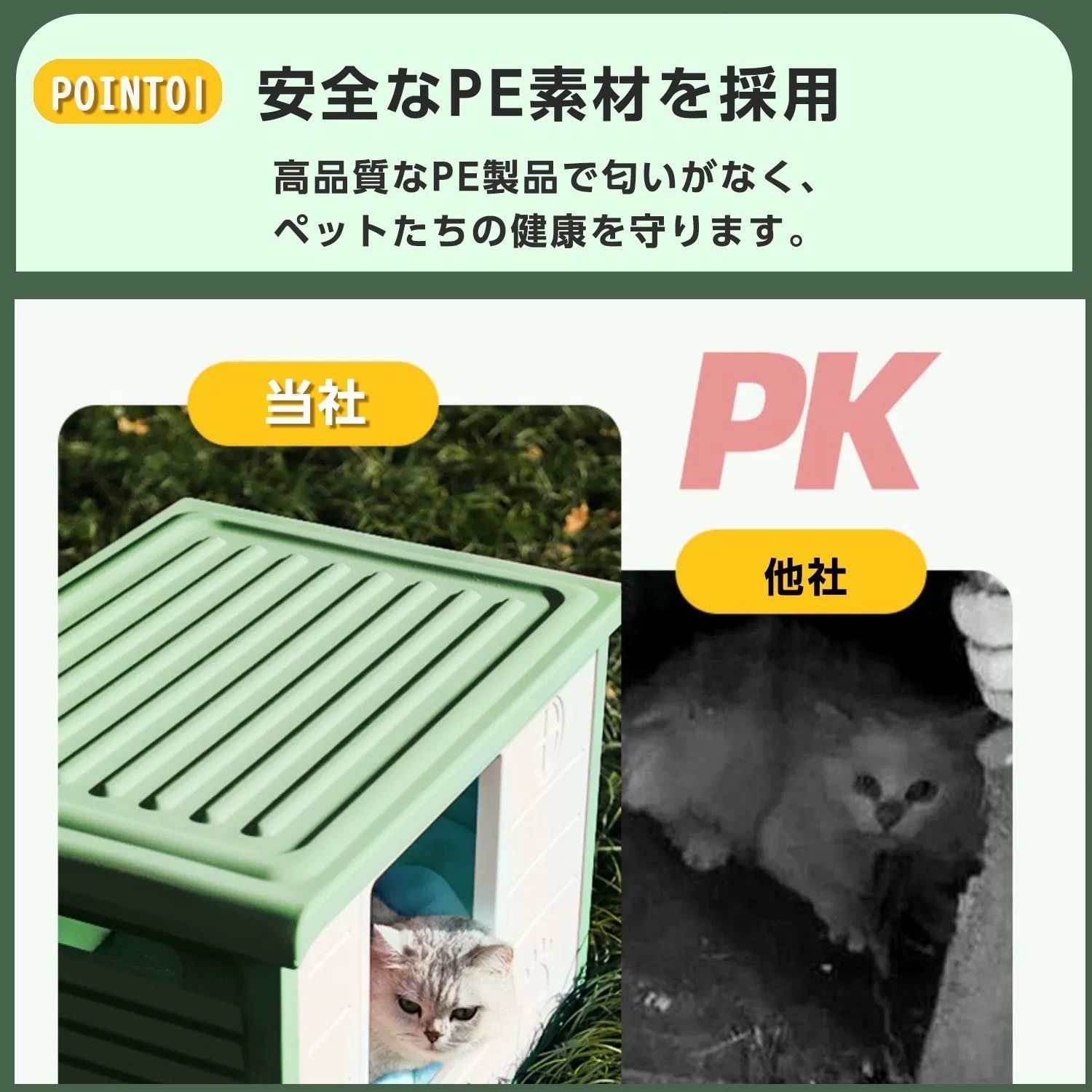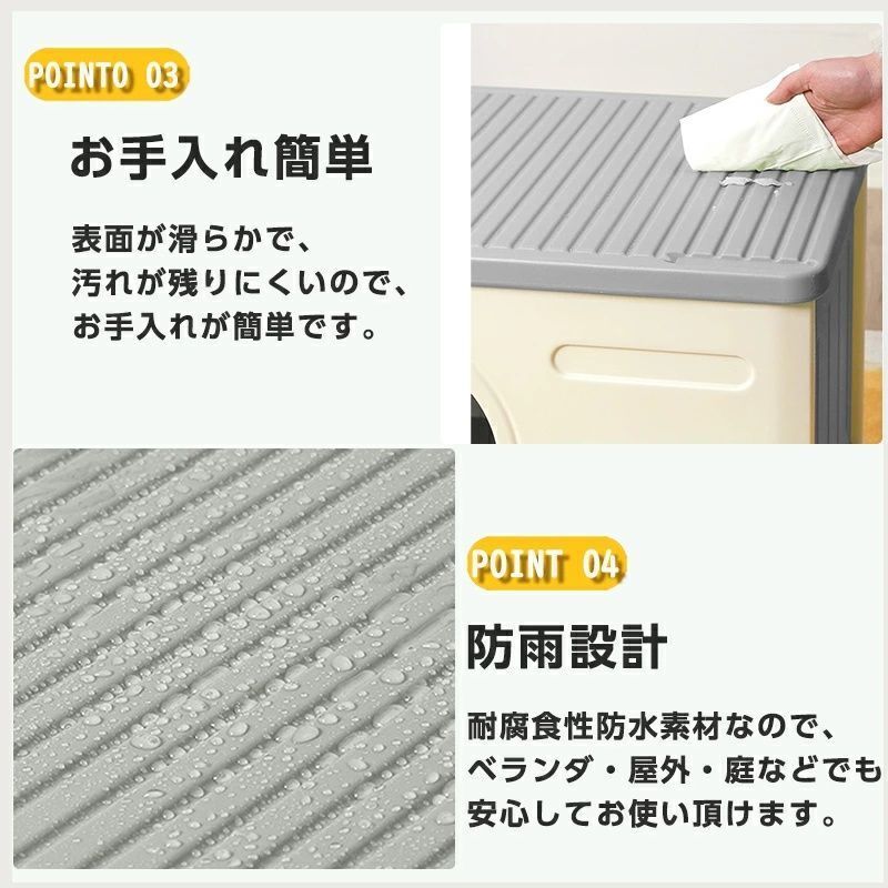 【商品紹介】 こちらのペットハウスの上部はフラットなデザインになっており、ハウス内はもちろん、上部でもくつろぐことができます。 ワンちゃんや猫ちゃんのお気に入りの場所作りにおススメです。 PE素材を使用することにより、匂いが少なく、匂いに敏感な動物たちにも安心して過ごして頂けます。 耐腐食性防水素材で出来ており、雨に強いです。屋外でのベランダや庭でも安心してお使い頂けます。 両側には通気口があるので、常に換気ができ、快適に過ごせます。