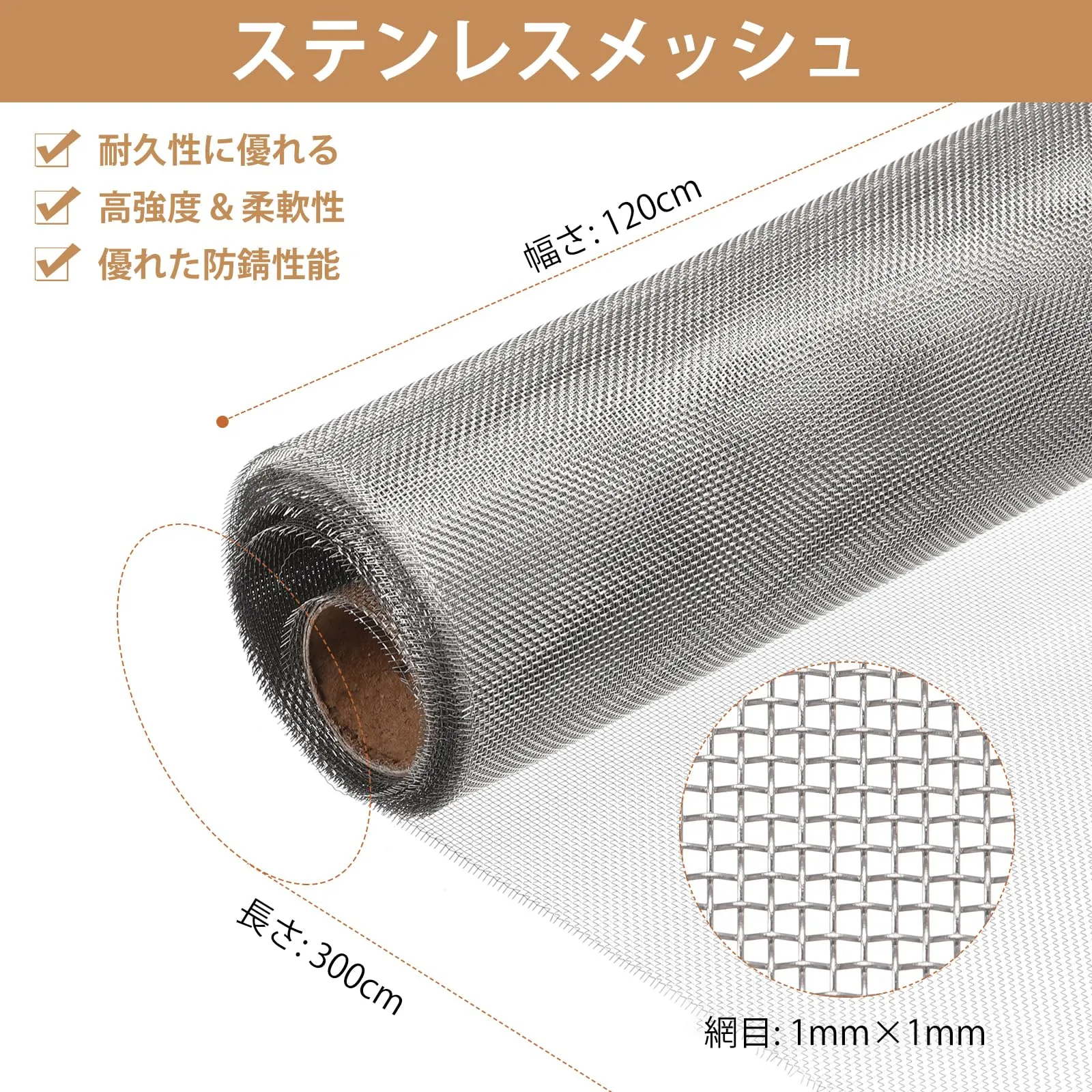 ステンレスメッシュ網×1枚、サイズ:300 cm x 120 cm、20メッシュ、網目:1 mm、線径:0.4 mm。