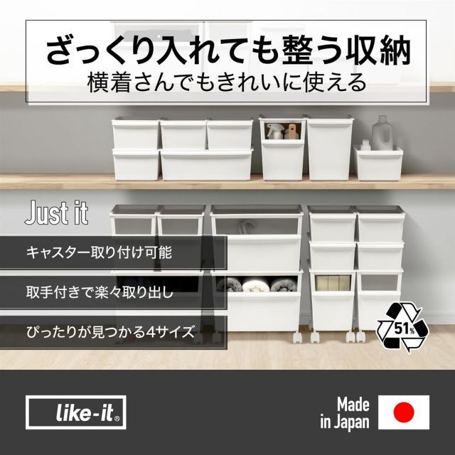 ライクイット (like-it) 収納ボックス ペットボトル 積み重ね 棚上 再生材51%以上使用 資源ごみ キャスター取り付け可能 約幅38x奥26.8x高26cm 日本製 コンテナー ワイド 深型 ホワイト JTR-01