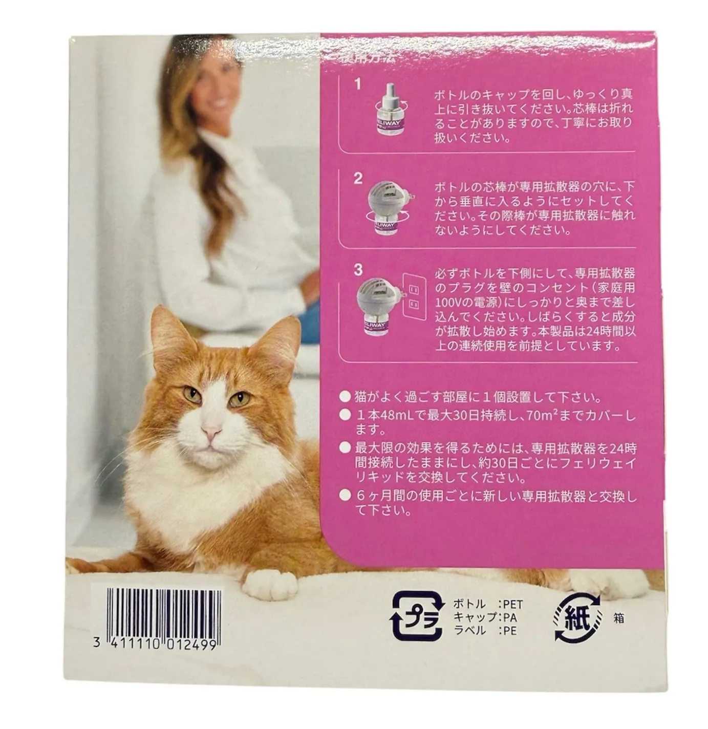 ●使用方法 ・猫がよくいる部屋に設置します。 ・リキッドを専用拡散器にセットし、壁のコンセントに垂直に差し込んでください。 ・猫が快適に感じられるために室内はある程度閉鎖的にしてください。 ・設置後は24時間連続で使用してください。 ・リキッドは月1回を目安に交換してください。