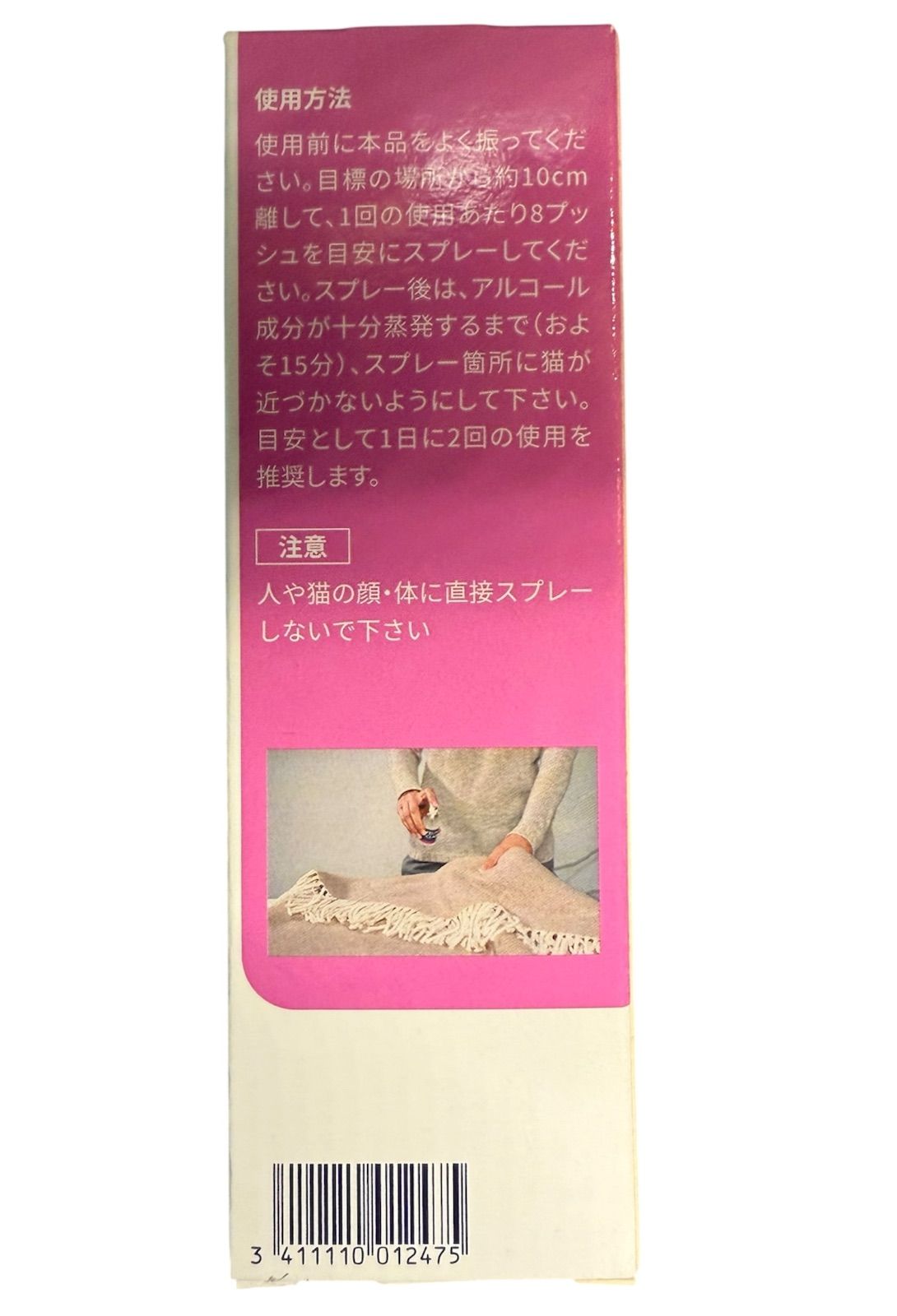 ●使用方法 ※火気厳禁 ・使用前に本品をよく振ってください。 ・本品を垂直にし、目標の場所から約10cm離してノズルを1回押してスプレーしてください。 ・目標の場所には8~10回スプレーしてください。 ・スプレー後は、アルコール成分が十分蒸発して から(およそ15分)、その環境に猫を入れるようにしてください。 注意:人や猫の顔・体に直接スプレーをしないでください。