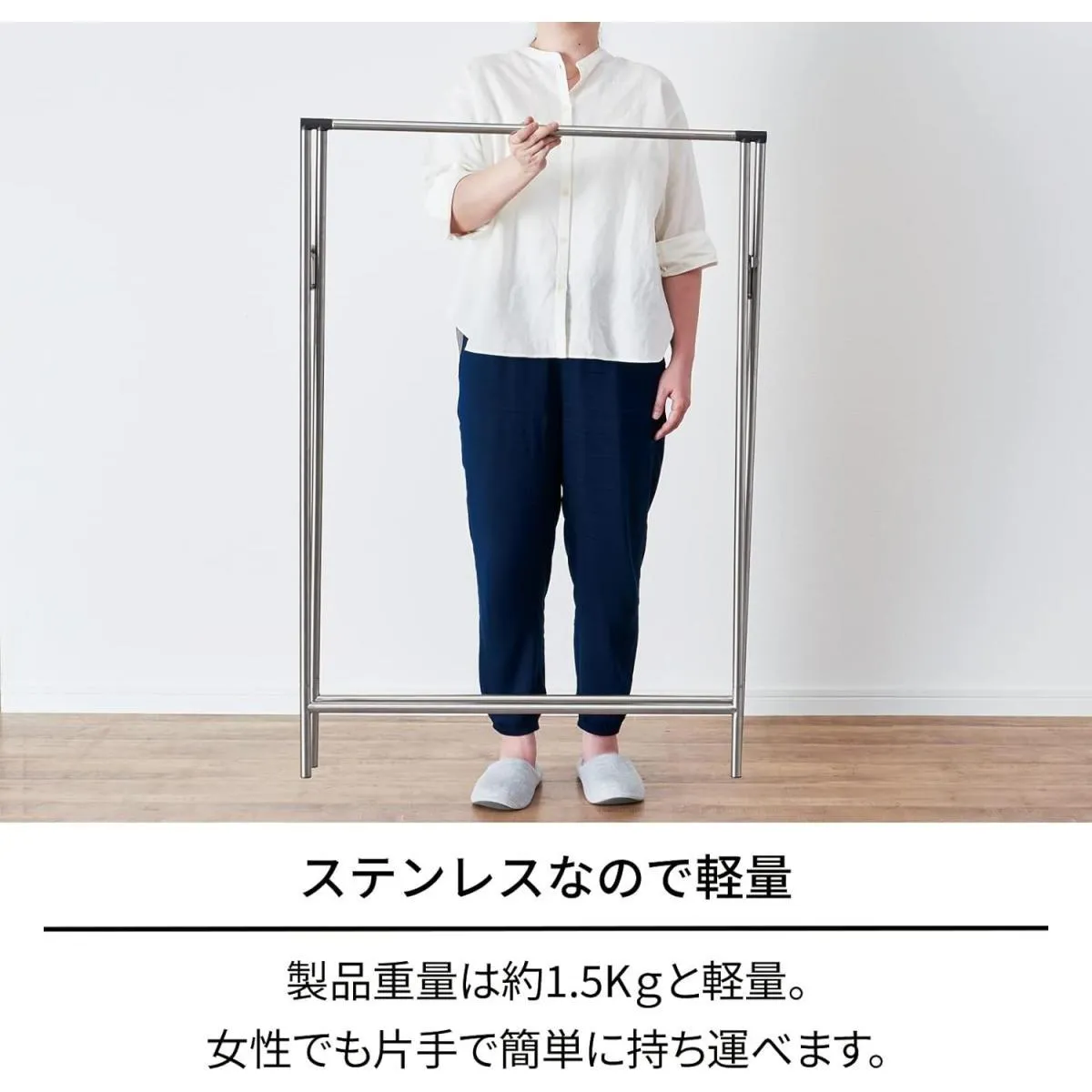 【商品仕様】 カラー:ステンレス 最大外寸(約):幅80×奥行52×高さ111cm 折りたたみサイズ(約):幅80×奥行4×高さ114cm 商品重量(約):1.5kg 全体耐荷重(約):8kg