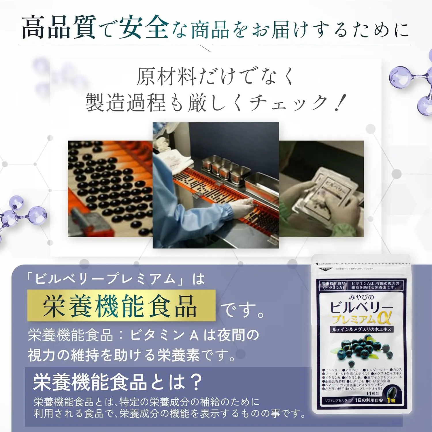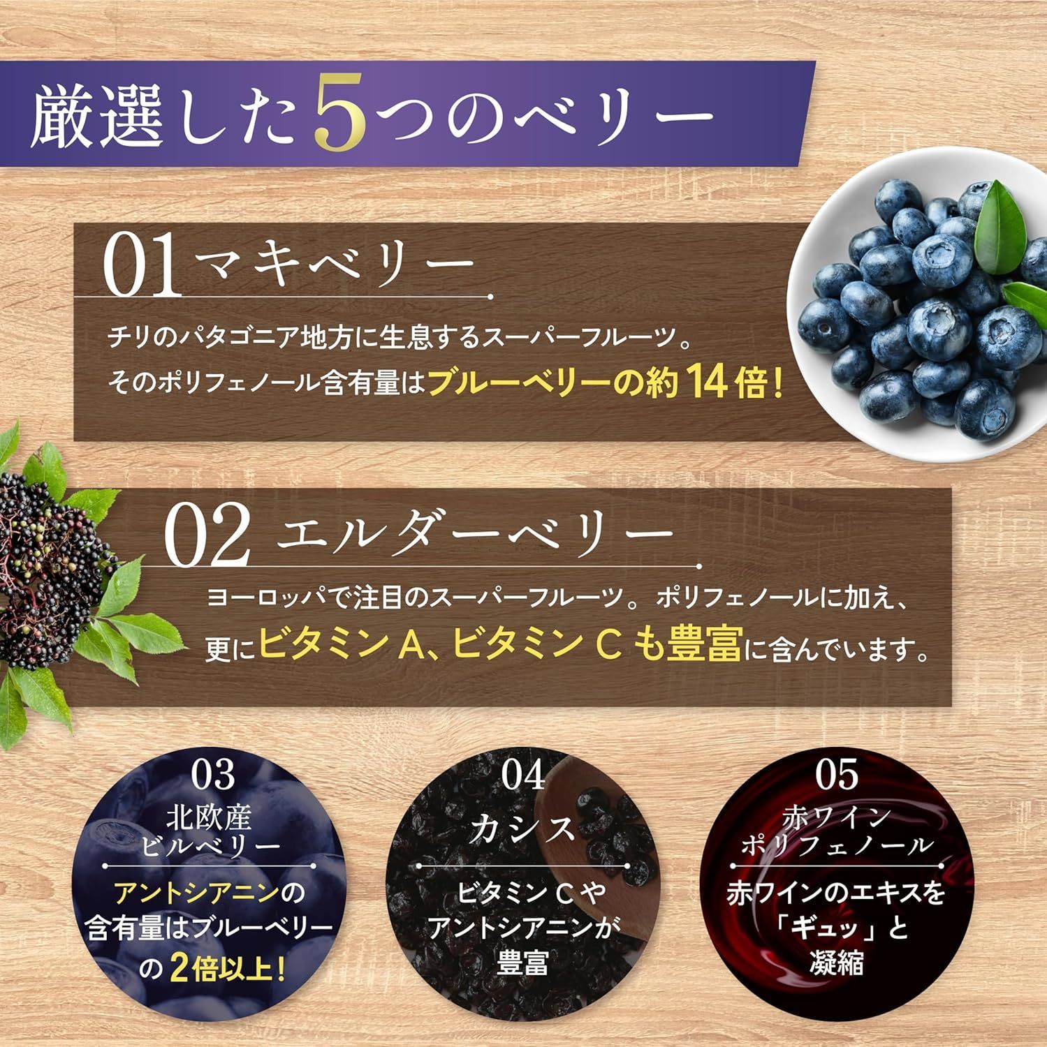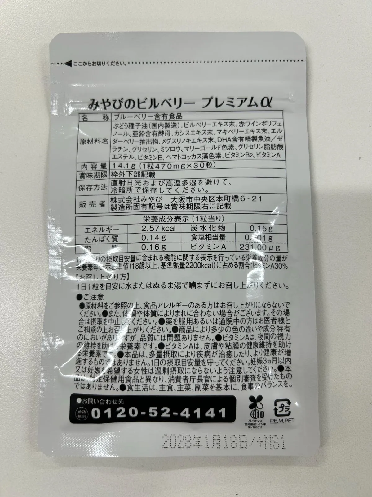 ■原材料 グレープシードオイル、ビルべリーエキス末、赤ワインポリフェノール、亜鉛含有酵母、カシスエキス末、マキベリーエキス末、メグスリノキ乾燥エキス末、DHA含有精製魚油、ゼラチン、グリセリン、ミツロウ、マリーゴールド色素、グリセリン脂肪酸エステル、ビタミンE、ヘマトコッカス藻色素、エルダーベリー果実色素、ビタミンB2、ビタミンA