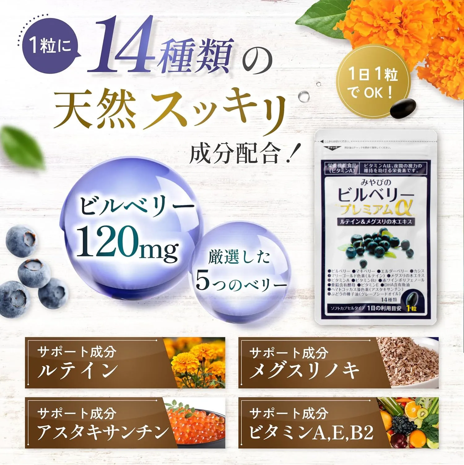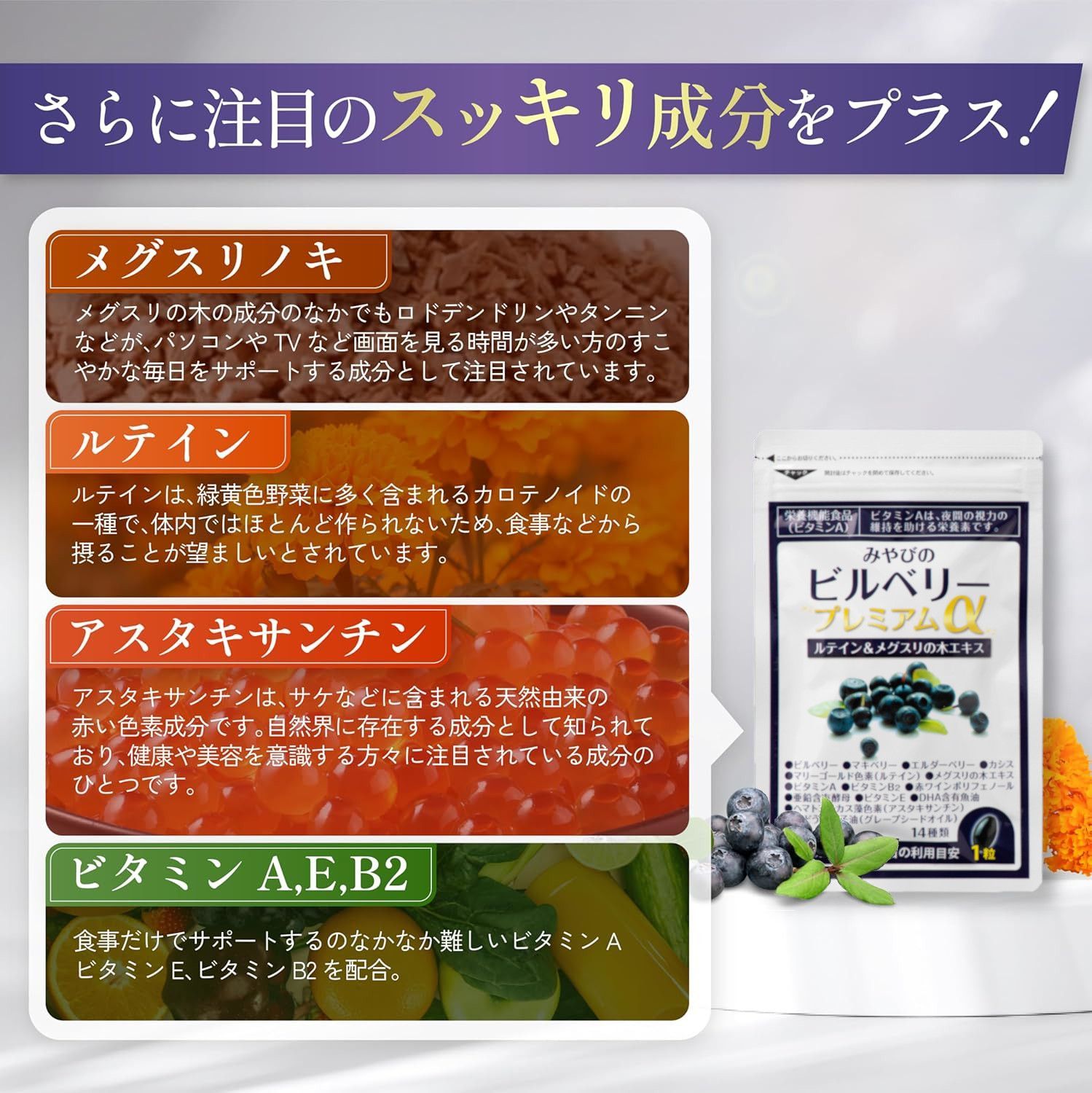 ■商品の詳細 ・北欧産「ビルベリー」を中心に、14種類の天然スッキリ成分を配合したアイケアサプリメント。 ・厳選した5つのベリーを使用。「マキベリー」「エルダーベリー」「ビルベリー」「カシス」「赤ワインポリフェノール」 ・さらに注目のスッキリ成分をプラス!「メグスリノキエキス」「ルテイン」「アスタキサンチン」「ビタミンA,E,B2」 ・ブルーベリーの約2~3倍のアントシアニンを含有するビルベリーを使用しています。 ・スマホやPCを長時間使う機会が多い現代。日々のクリアな毎日を内側からサポートするために、取り入れたいサプリメントのひとつです。