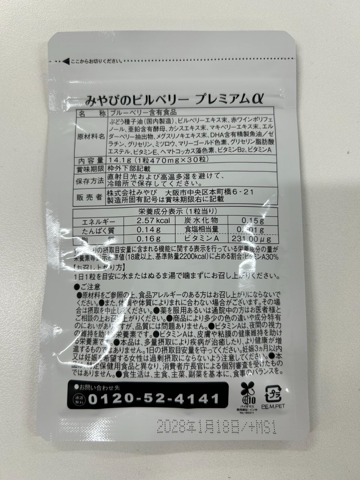 ■注意事項 ・原材料をご参照の上、食品アレルギーのある方はお召し上がりにならないでください。 ・また、体調や体質によりまれに合わない場合がございます。その場合は摂取を中止してください。 ・薬を服用あるいは通院中の方はお医者様とご相談の上お召し上がりください。 ・商品により多少の色の違いや成分特有のにおいがありますが、品質には問題ありません。 ・ビタミンAは、夜間の視力の維持を助ける栄養素です。 ・ビタミンAは、皮膚や粘膜の健康維持を助ける栄養素です。 ・本品は、多量摂取により疾病が治癒したり、より健康が増進するものではありません。1日の摂取目安量を守ってください。妊娠3ヵ月以内又は妊娠を希望する女性は過剰摂取にならないよう注意してください。 ・本品は、特定保健用食品と異なり、消費者庁長官による個別審査を受けたものではありません。 食生活は、主食、主菜、副菜を基本に、食事のバランスを。 販売元 株式会社みやび