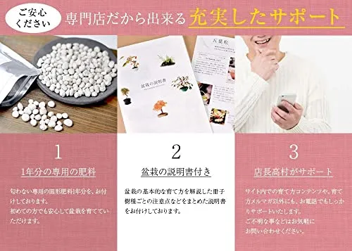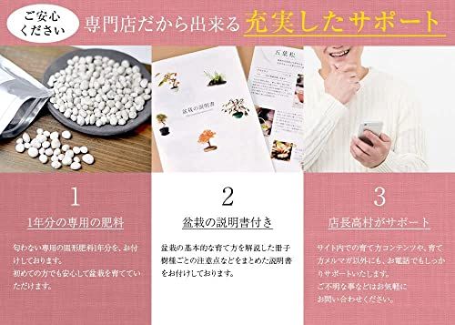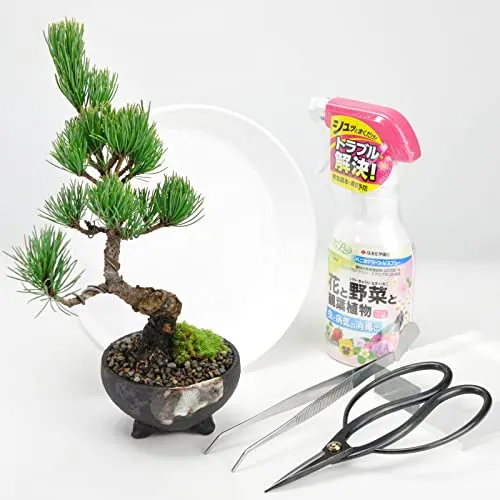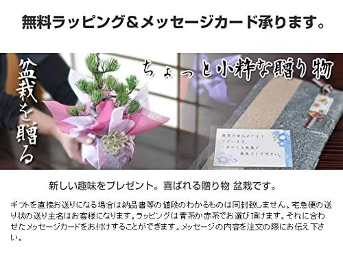 【道具セット内容物】剪定鋏1、害虫駆除剤1、ヘラ付きピンセット1、作業用受け皿1 付属品?基本の育て方、樹種別の説明書に加えて一年分の固形肥料が付属いたしますので、初めての方や初心者の方でも比較的簡単に安心して管理していただけます。新しい趣味としても人気があります。 ギフト対応?無料にてラッピング、メッセージカードを承っておりますので、誕生日や還暦等お祝いのプレゼント、母の日や父の日、敬老の日といった記念日でのギフト、退職祝いの際など、大切な人へお祝いの贈り物にも。 松の名産地、香川県で生産された樹齢67年程の五葉松です。信楽焼の鉢に植替え、苔と砂利で化粧も施してあるため、届いてすぐにおしゃれで渋みのある和のインテリアとしてお楽しみいただけます。もともと高地に自生し、厳しい寒さに耐えて育つ丈夫な木のためとても育てやすい五葉松に基本的なお手入れに便利なハサミ、薬剤、ピンセット、受け皿がセットになっており、新たな趣味として盆栽を始めてみたいとお考えの方にもおすすめのセットです。 育て方?