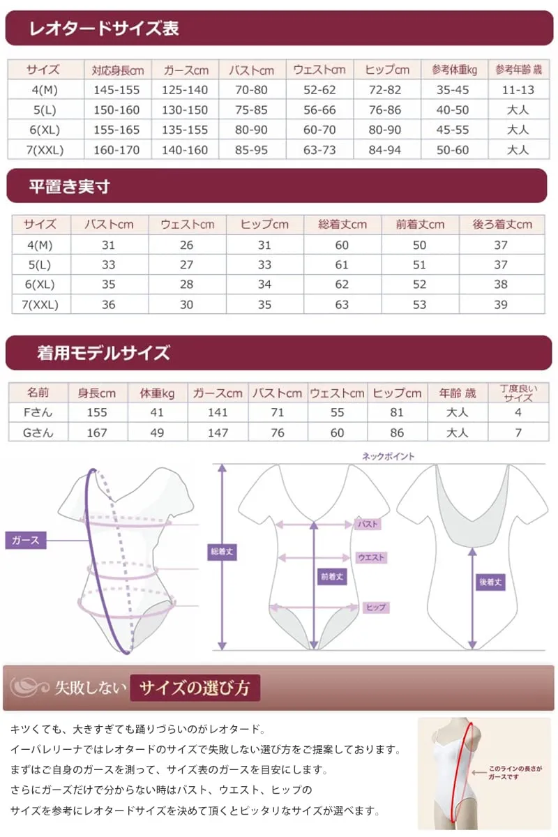 ※ガース:片方の肩の中心から股下をくぐって、また同じ肩まで測った長さ。レオタードの伸縮性を考慮してガースを決めております。