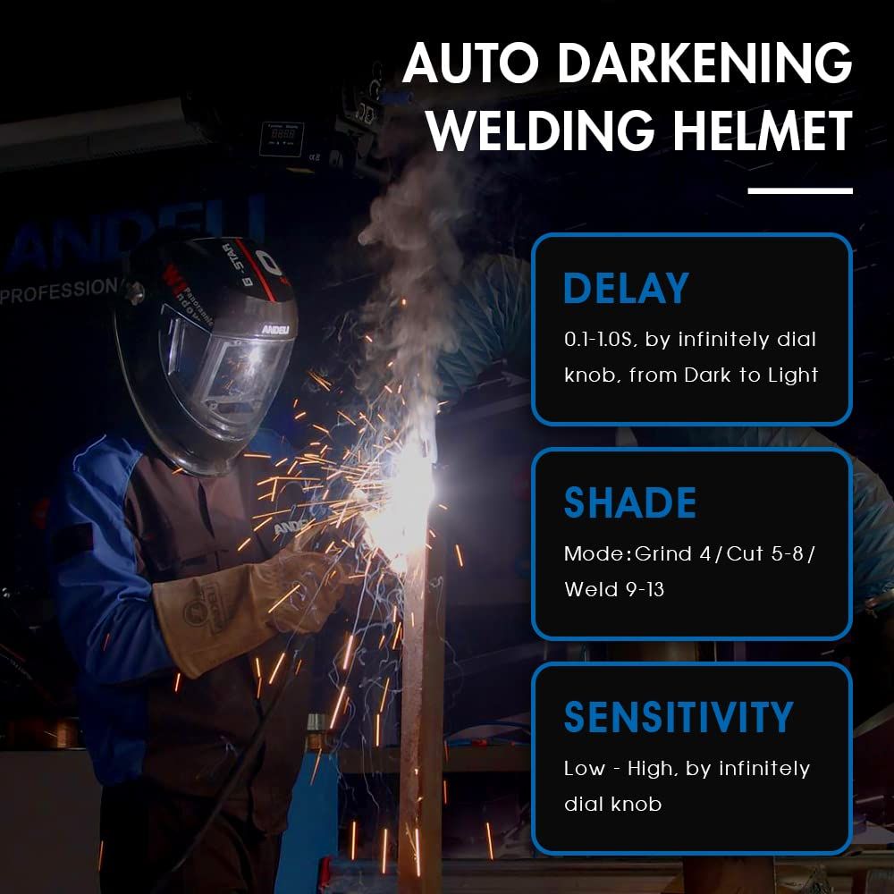 高品質アークセンサーと太陽電池パネル技術を搭載した。遮光スピードは 1/30000 秒以内に自動遮光します、高感度プローブと組み合わせると、画面に一瞬に暗くなり、目に優しい。遮光度:反応前DIN-4・反応後DIN5~8/9~13。