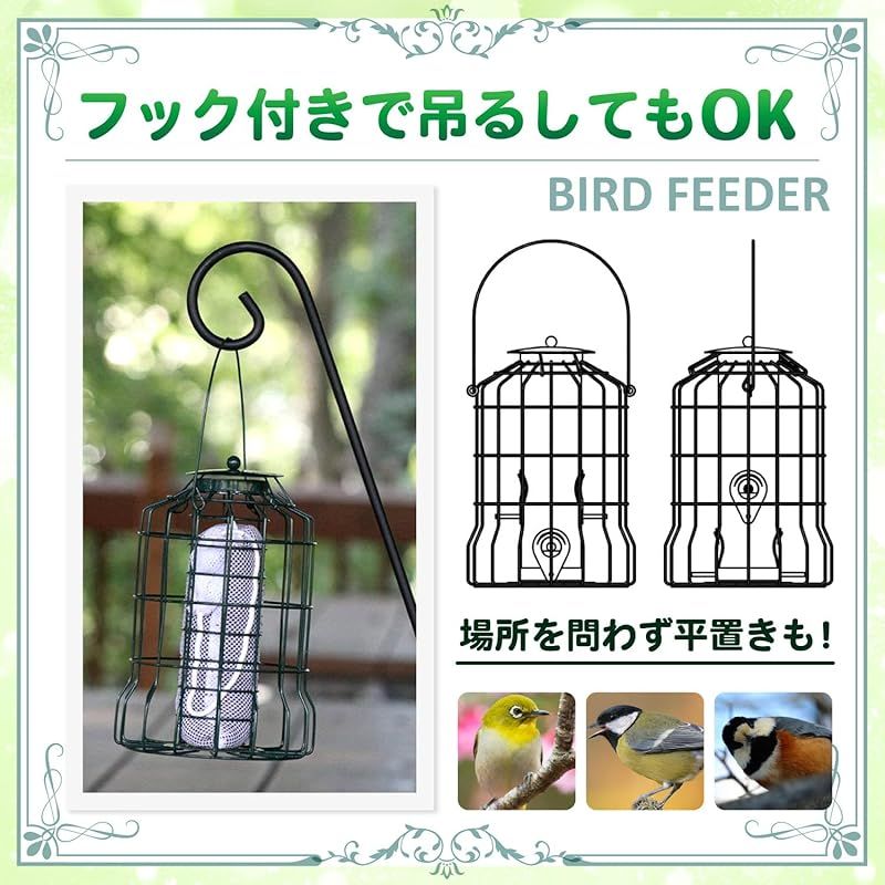 【商品概要】 バードフィーダー ヒヨドリよけ えさ台:庭でゆっくりと野鳥観察は楽しいですが、ヒヨドリに邪魔されるのは困りますよね。そんなお悩みに、ヒヨドリ対策をした、小鳥だけにエサを提供する野鳥の餌台が登場です。緑のエサ台です。 一般的な鳥の餌台を設置しても、ヒヨドリが大きな声でやってきては騒ぎ立て、他の小鳥たちが近寄れない、という経験はありませんか?鳥餌台に来るヒヨドリをどうにかしたい。鳥のエサがみんな食べられてします。そんな悩みを解決するのがこのバードフィーダーです。こちらは 野鳥 餌入れ 屋外用です。 鳥のえさ台は、防護柵付きでヒヨドリ侵入を防ぎ、小鳥たちの安心空間を実現。約3cmの格子で、小鳥が快適に食事を楽しめる設計。エサ補充も簡単。メジロ、シジュウカラ、ヤマガラなど、小鳥たちが安全に食事を楽しめるバードフィーダー 屋外です。 バードフィーダー オクガイのサイズとカラー:25cm(底から取手まで)、取手14.5cm、幅17cm ブラックとグリーンの2色 ※モニターの環境によっては、実際の色と若干異なる場合があります。※鳥のえさだいは、ヒヨドリの大きさによっては、鳥のえさだいの中に入れる場合もございます。また、ヒヨドリより小さいムクドリの場合も同様となります。 推奨事項:バードフィーダー 吊り下げは、容器を清潔に保つため定期的な掃除。穀物をたくさん入れすぎると詰まる原因になります。エサの上は屋根付きですが、大雨等の場合水の侵入で餌が腐る場合もございます。設置は雨で濡れない所がおすすめです