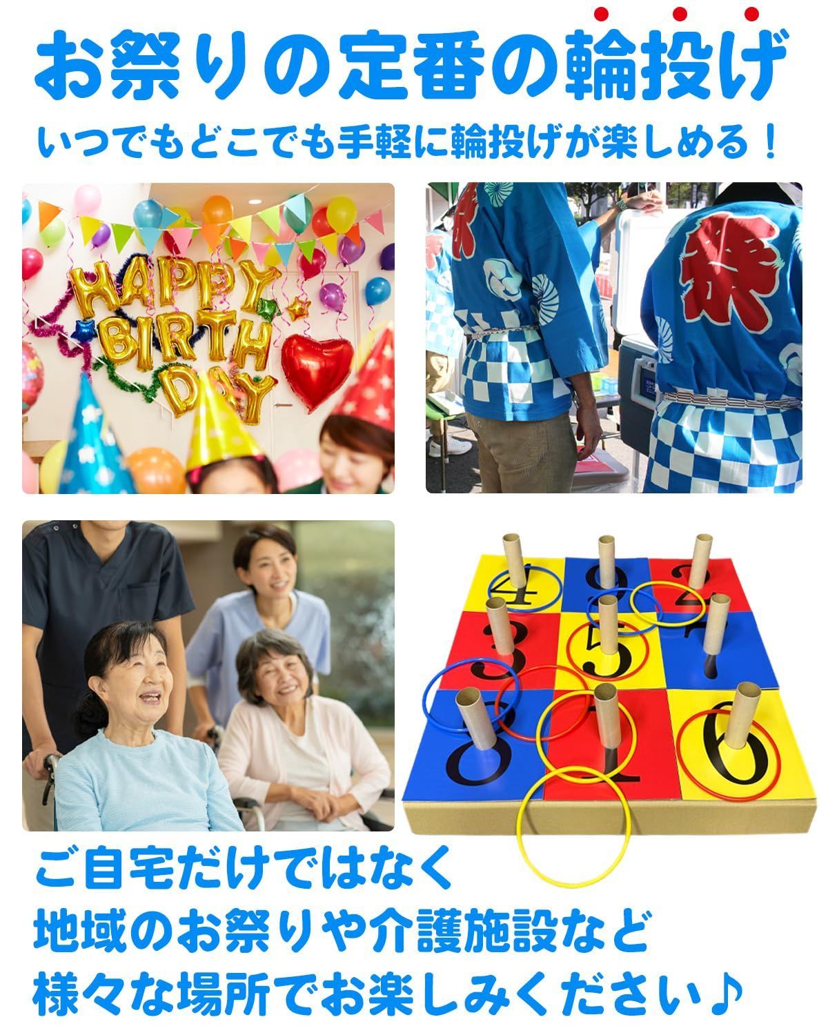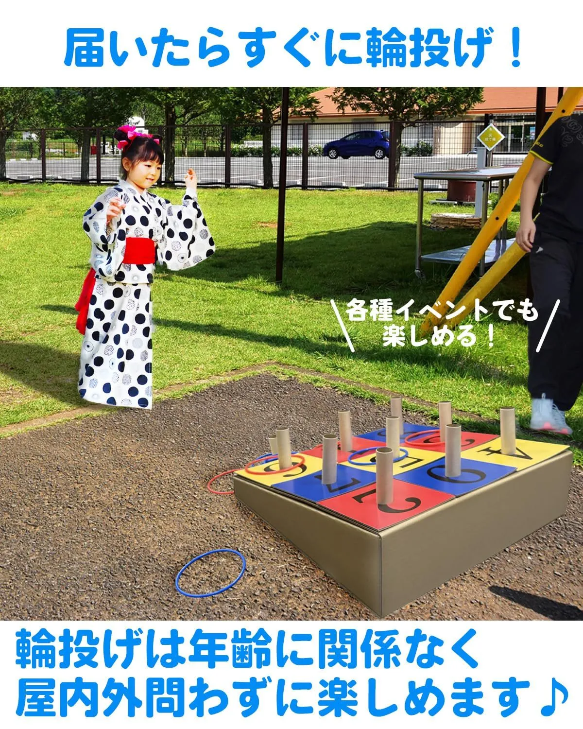 【遊び方色々】人数やシーンに合わせて様々なルールで遊べます♪(例)支柱に数字:支柱に数字を付け、合計点で競い合う。色の指定:支柱の色と輪の色を一致させて投げる。ビンゴ形式:輪が縦横斜めに並ぶとビンゴとなる。チーム戦:複数人で輪投げをして、合計得点で競い合う。