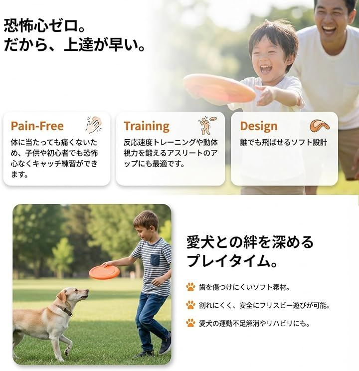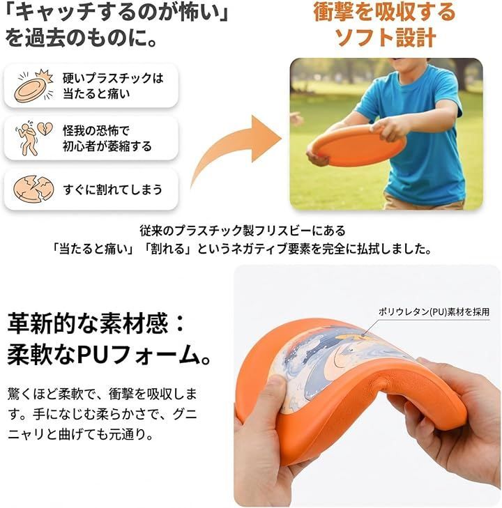 「誰でも飛ばせるソフト設計」手になじむ柔らかい素材で、キャッチしやすく痛みもありません。