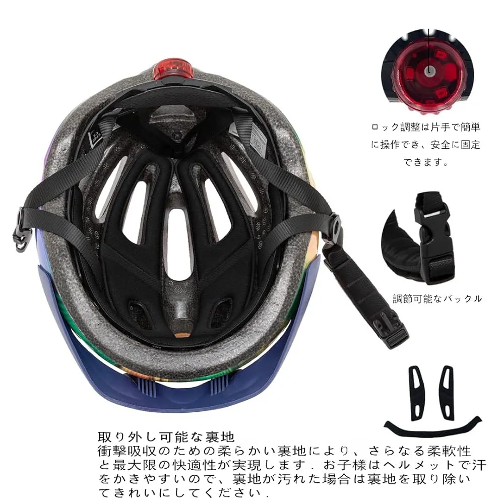 【セキュリティと保護】 この子供用ヘルメット 自転車は、丈夫で耐久性のある PC シェルと軽量の衝撃吸収 EPS フォームが衝撃を吸収し、衝突時の子供の頭部への衝撃による損傷を最小限に抑えます。 自転車ヘルメット子供用 小学生厚くて柔らかいヒートシールされた裏地と自転車用ヘルメットのあごパッドは、子供の頭を摩耗から効果的に保護します。 自転車用 ヘルメットには、安全インジケーターの 3 つのモード (長い点灯/遅い点滅/速い点滅) があり、曇りの日や夜間の走行時にお子様の安全性を高めます。 バッテリーの電力がなくなったら、CR2032 リチウム金属バッテリーを時間内に交換してください