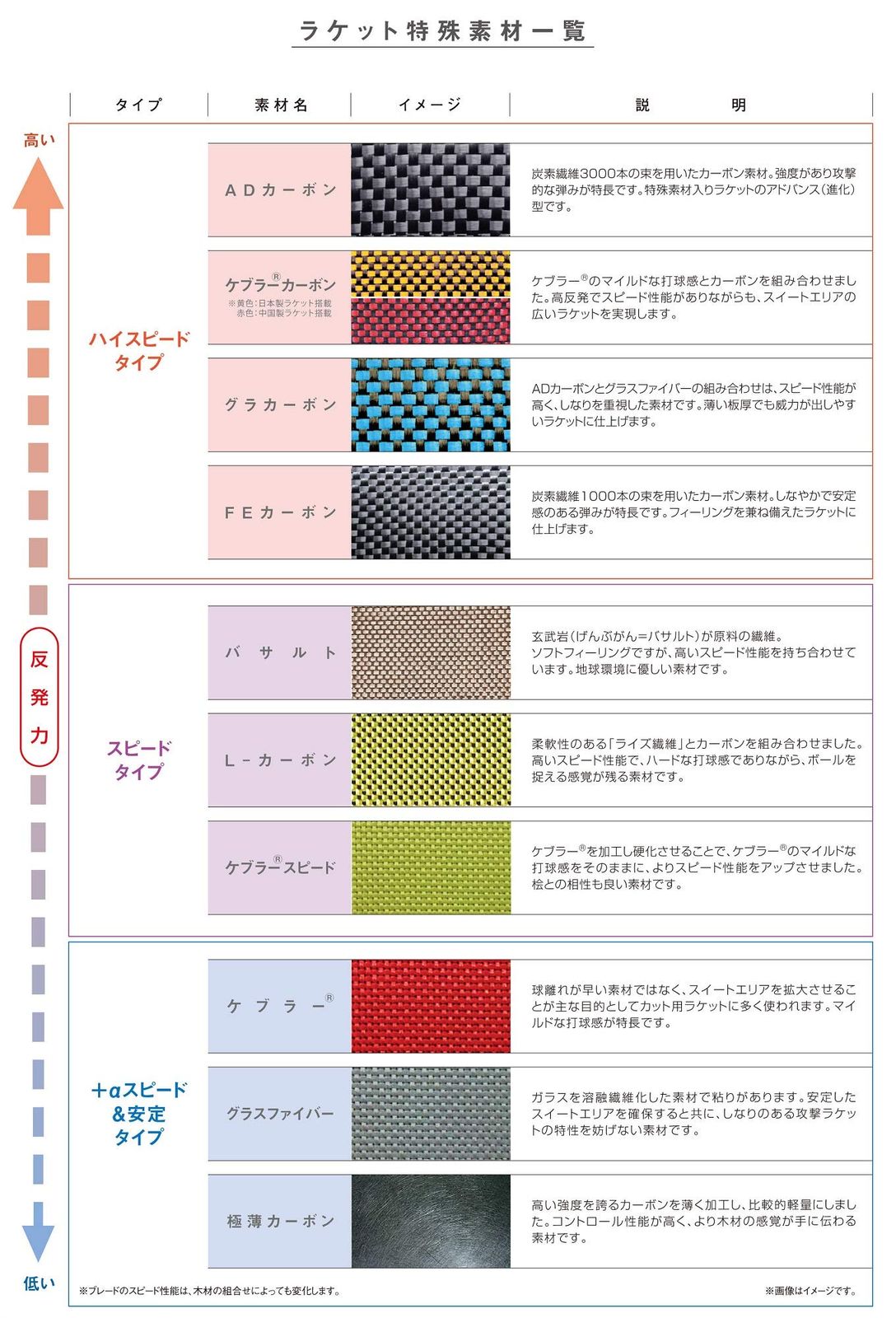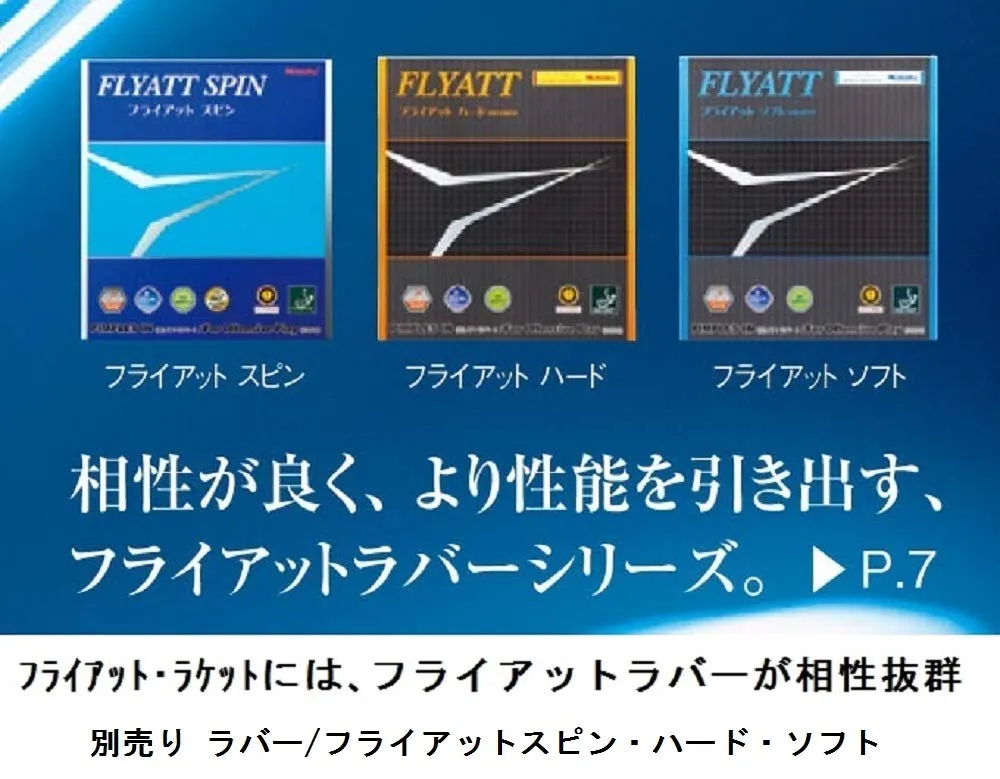 軽量かつ、打球感の良さを重視した木材を用いた5枚合板に極薄カーボンを搭載することで、スピード性能をアップさせました。板厚を6.0mmに設定することで、スピード性能と威力を確保するとともに、扱い易さと、ドライブの安定性を実現しました。「フライアット」を貼り合わせることによって、「フライアット」のスピード性能と打球感をさらに際立たせ、“弧を描く安定性した連続ドライブが可能となります。