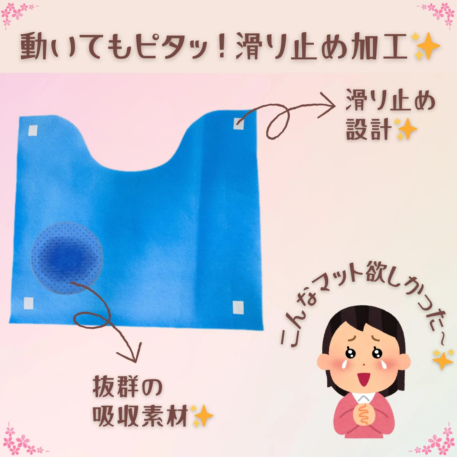 【滑り止め加工でズレにくい!どんなトイレにも合う安心安全設計】マットの裏面にはしっかりとした滑り止め加工を施しており、トイレへの出入りや着座の際にもマットがズレたりめくれたりする心配がありません。薄型でつまずきにくい設計のため、足元が不安なご高齢の方や、元気いっぱいなお子様のトイレトレーニング(トイトレ)時でも安心してお使いいただけます。横幅56cm×縦48cmのゆったりサイズで、ご家庭の洋式トイレはもちろん、男性用小便器や介護用ポータブルトイレなど、どんな形状のトイレにもフィットしやすく、足元を広範囲にカバーします。