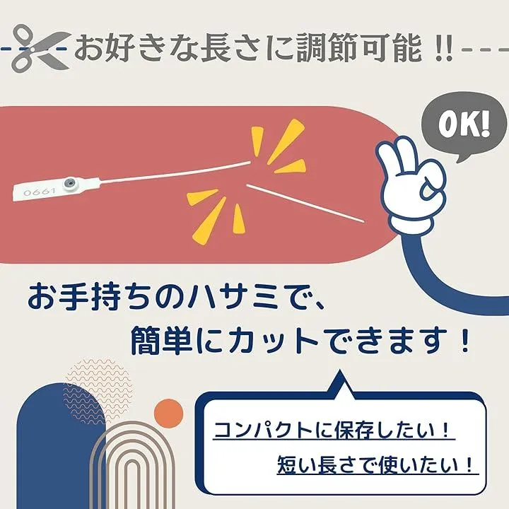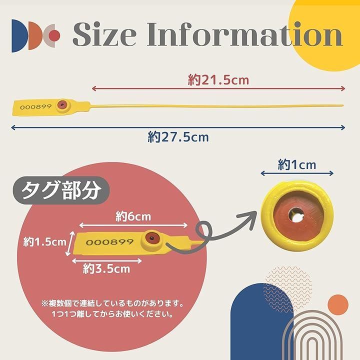 「商品仕様」全長:約275mm,幅:約15mm,ループ部分:約215mm,素材:PP、PE、スチール製ロックシリンダー,セット数:赤x100