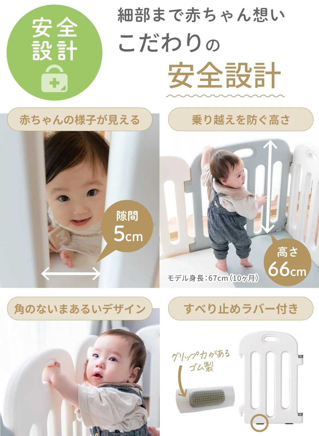 【安全な設計】家事でバタバタして少し離れているときもサークル内赤ちゃんの様子が見るようにフェンス幅は約5cmに設計しました。パネル高さは約66cmなので赤ちゃんが乗り越えれない、でもパパママは跨ぐことのできるちょうどいい高さ♪