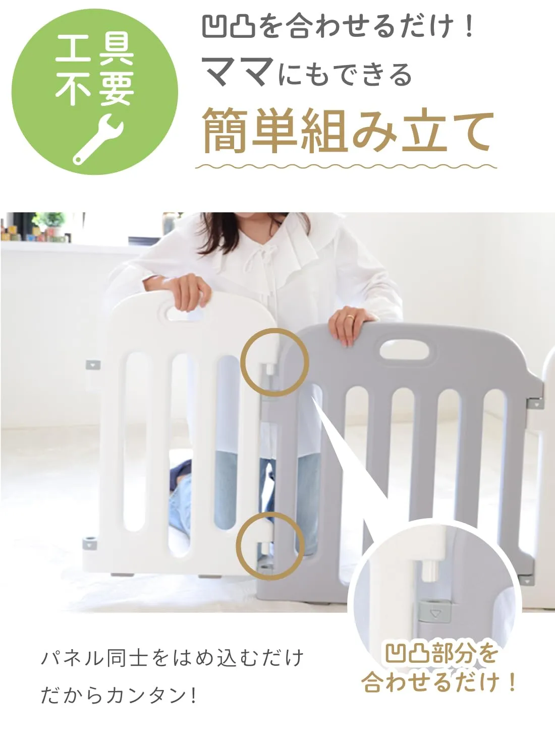 【組み立て簡単/サイズ・形のアレンジ自在】ケラッタのベビーサークルはパネル同士をはめ込むジョイント式なので、ママでも簡単に組み立てができる!パネルを減らせばサイズの調整ができ、組み立て方を変えてL字型や丸形にでき、用途やシーンに合わせてフレキシブルに使えるのがうれしい!